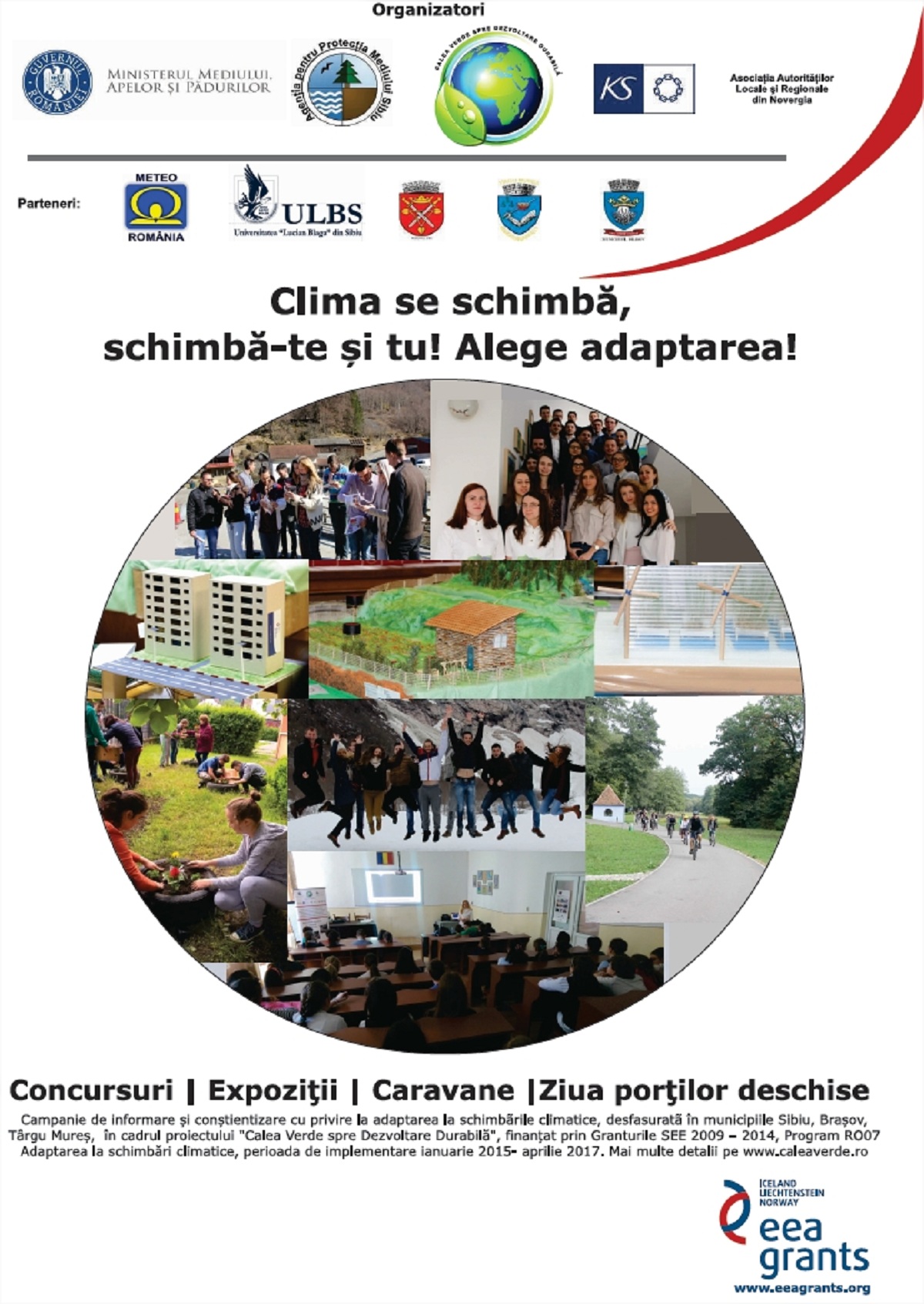Agenţia pentru Protecţia Mediului Sibiu, promotor al proiectului ”Calea Verde spre Dezvoltare Durabilă” organizează în perioada 31.10 -08.11.2016 Caravana ”Calea verde” în municipiile Sibiu, Braşov şi Tg. Mureş. Caravana se desfăşoară în cadrul campaniei ”Clima se schimbă, schimbă-te şi tu! Alege adaptarea”, având rol în creşterea gradului de informare şi conştientizare a publicului, cu privire la adaptarea la schimbările climatice, beneficiile aduse de implementarea activităţilor proiectului, asigurarea vizibilităţii contribuţiei Granturilor SEE 2009-2014.
