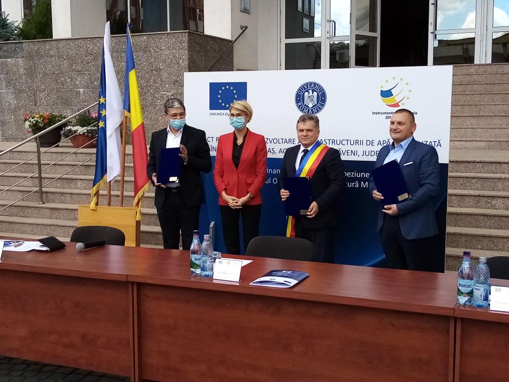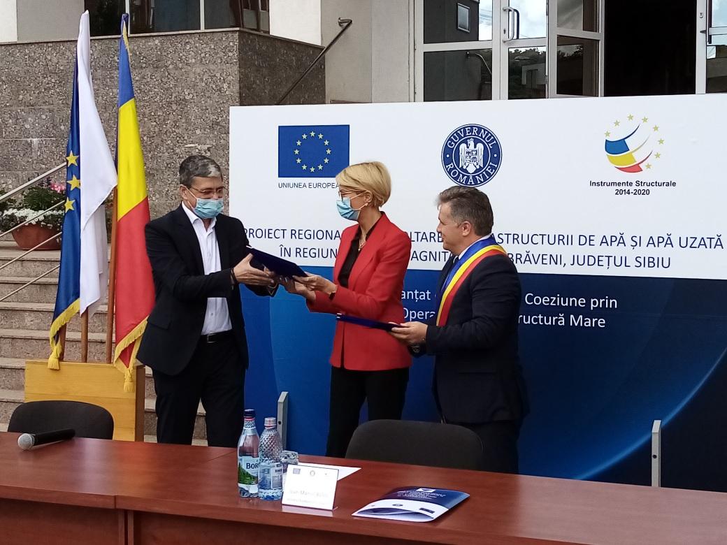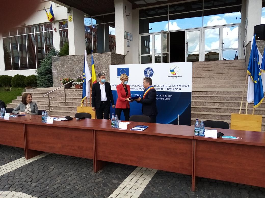 Documentul a fost semnat de către primarul Mediașului Gheorghe Roman, ministrul Fondurilor Europene Marcel Boloș și directorul Apa Târnavei Mari Mediaș Ioan Munteanu. Este vorba despre un contract în valoare de aproximativ 122 de milioane de Euro, fonduri europene care vor fi folosite pentru reabilitarea infrastructurii de apă și canalizare pe mai multe străzi din Mediaș, dar și în localitățile din nord-estul județului Sibiu.