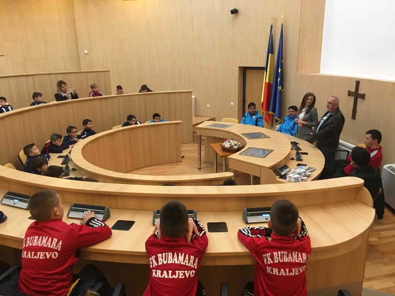 Sala Consiliului Județean Sibiu a fost, vineri, locul de desfășurare al unei întâlniri inedite: președinta Daniela Cîmpean a primit vizita a 30 de sportivi juniori de la Interstar Sibiu și Bubamara Kralievo, din Serbia. Micii fotbaliști români și sârbi s-au arătat interesați să afle cum funcționează o autoritate județeană și au aflat chiar de la liderul instituției cum se votează hotărârile. În cadrul parteneriatului dezvoltat între Județul Sibiu și Districtul Raška, din Serbia, în perioada 30 martie – 1 aprilie 2018, echipa de fotbal Bubamara Kralievo participă la Cupa Interstar pentru copii și juniori, ediția a XII-a, organizată la Sibiu.