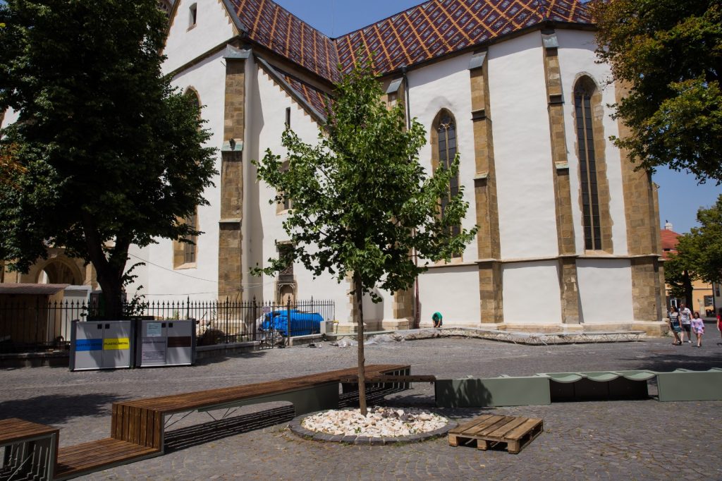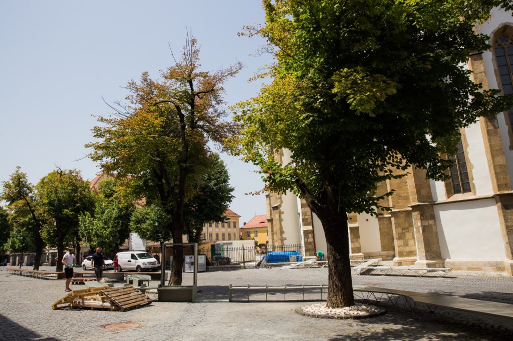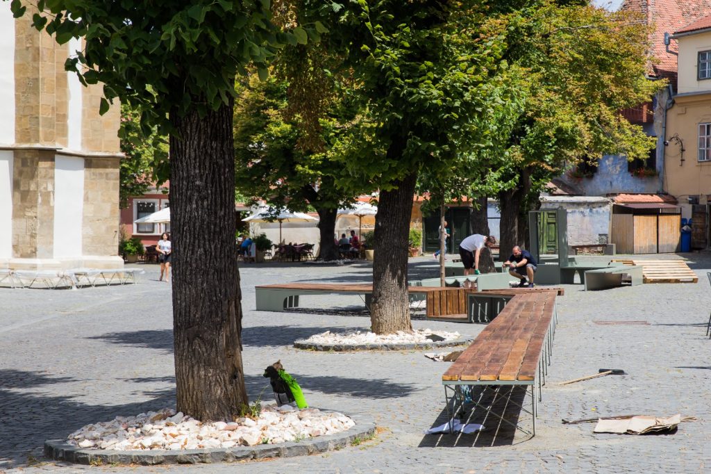Zilele acestea se face deja montajul acestor bănci și bolcuri de beton, care ar trebui să ofere spațiu suficient sibienilor și turiștilor pentru a se relaxa la umbra companilor din Piața Huet și sub răcoarea Catedralei Evanghelice.