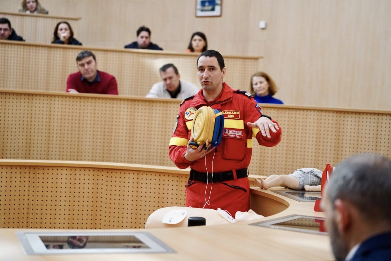 Ulterior, la Consiliul Județean Sibiu a fost organizat un instructaj de prim ajutor de bază, iar la Primăria Municipiului Sibiu s-a desfășurat un instructaj privind utilizarea stingătoarelor și a hidranților interiori.