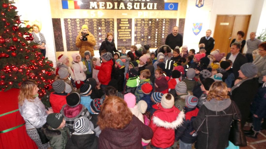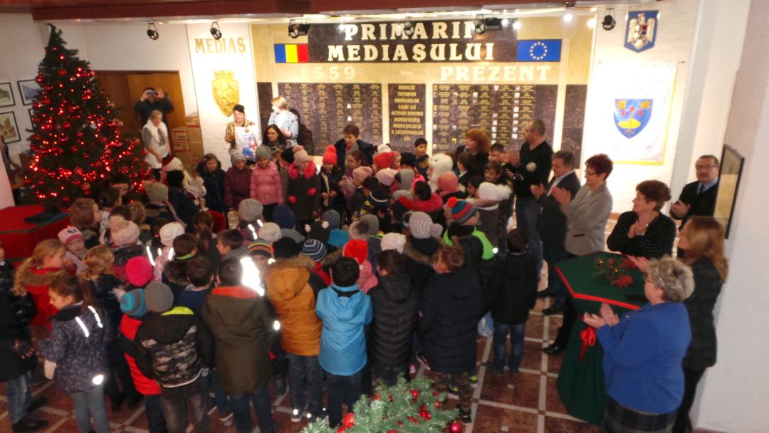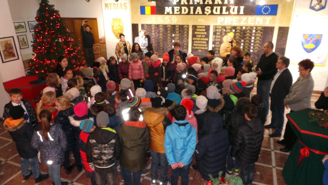 Primii colindători au ajuns deja la sediul municipalității. Reprezentanții primăriei, în frunte cu primarul Gheorghe Roman, au ascultat minunatele colinde, le-au mulțumit la final tuturor celor peste 300 de colindători iar Moș Crăciun le-a oferit tuturor celor prezenți mii de cadouri. De asemenea, edilul șef al Mediașului le-a transmis tuturor celor prezenți tradiționale urare „Sărbători Fericite” și un an 2019 mult mai bun și plin de realizări.