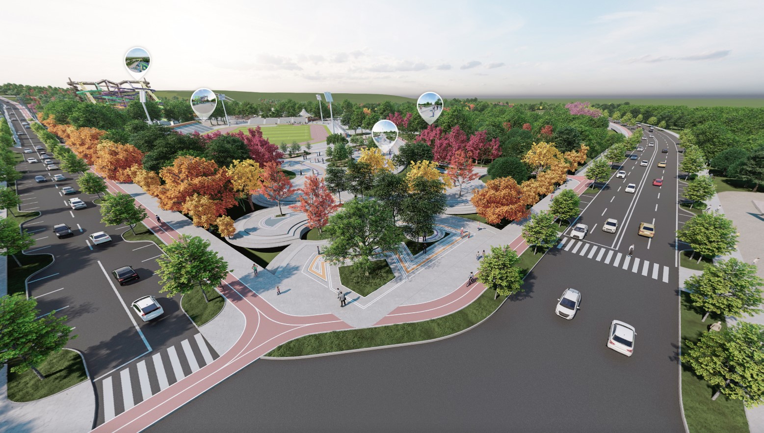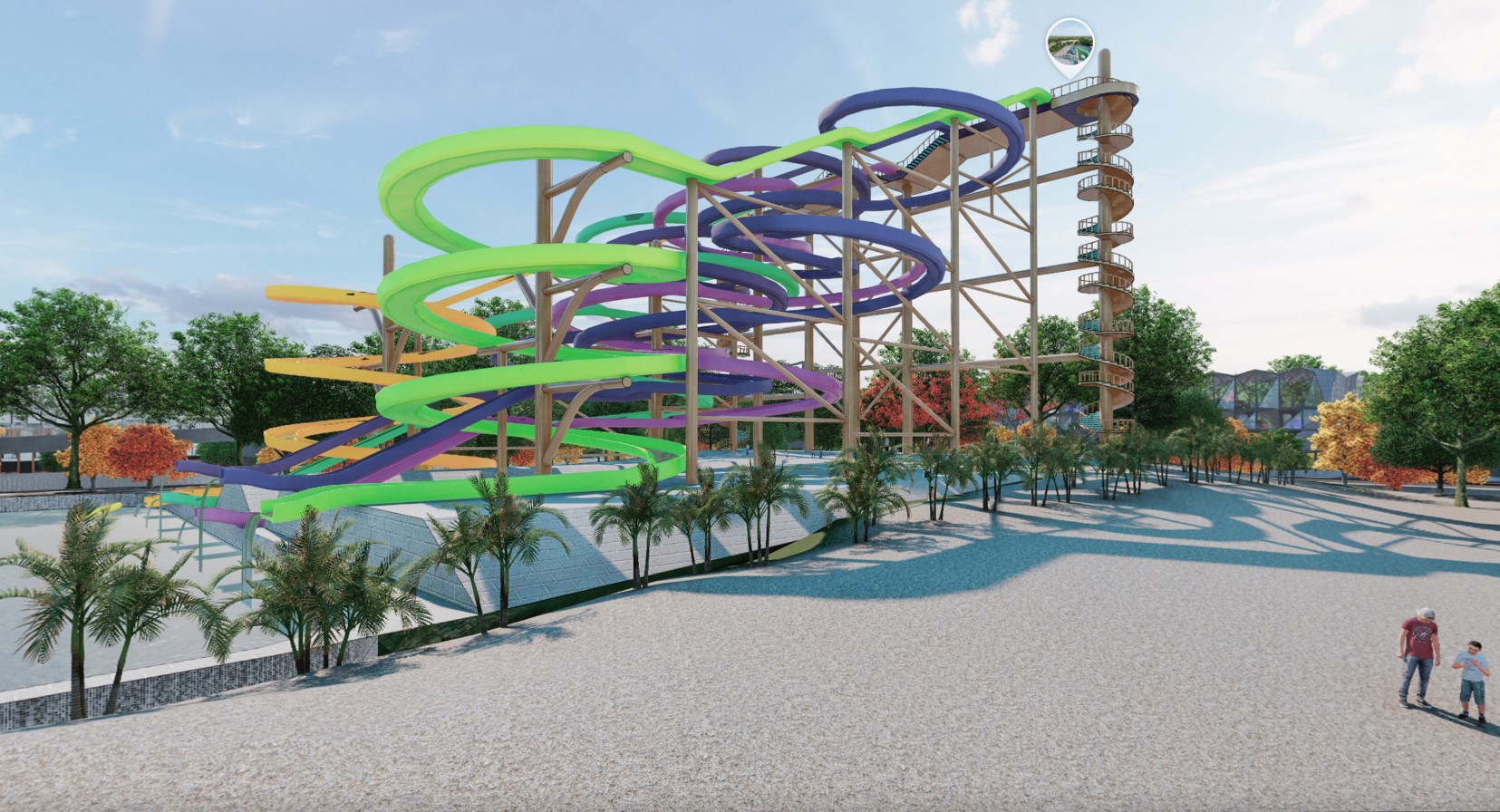 Aqua Park-ul se va găsi în zona Sport și agrement: spații verzi, terenuri de sport, un stadion de dimensiuni mici – medii, cu tribune, aparate de fitness în aer liber etc. De asemenea, sunt prevăzute diferite săli pentru sport, fitness, SPA, piscină acoperită, spații de joacă. Aici va fi inclus centrul acvatic de tip aqua-park, care va ocupa un loc central.