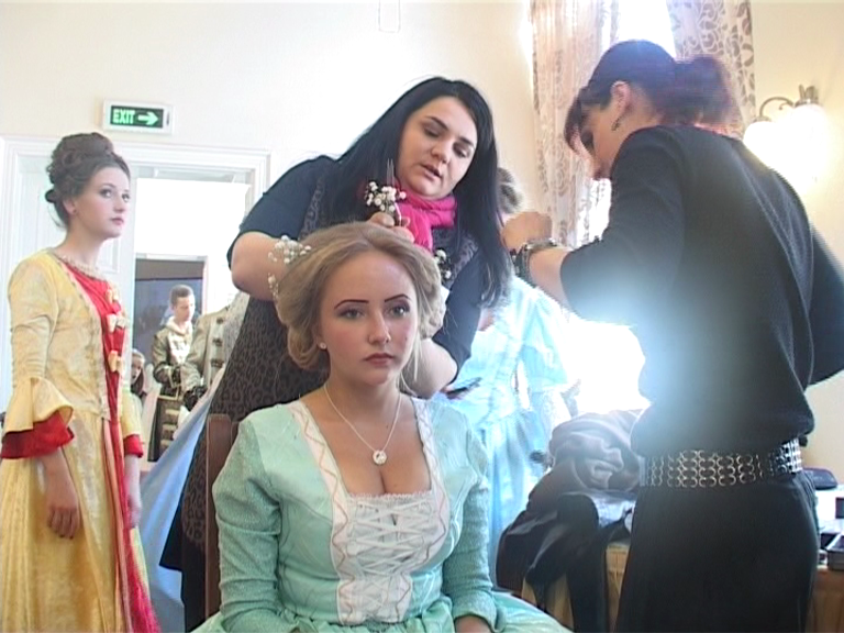 pregătit toată ziua ca să fie adevărate domnițe. Rochiile ample și diafane trebuiau completate însă de coafuri sofisticate și machiaj specific perioadei baroc. Așa că tinerele aspirante la titlul de Miss au petrecut ore bune în salonul baroc. „Dacă grandoarea și luxul se regăsesc în vestimentație și în coafură, machiajul trebuie să fie subtil, simplu, delicat. Folosim mult alb pentru că tenul trebuie să fie foarte alb, roz în obrăjiori și bineînțeles buzele roșii.” ne-a spus Laura Baciu, make-up artist
