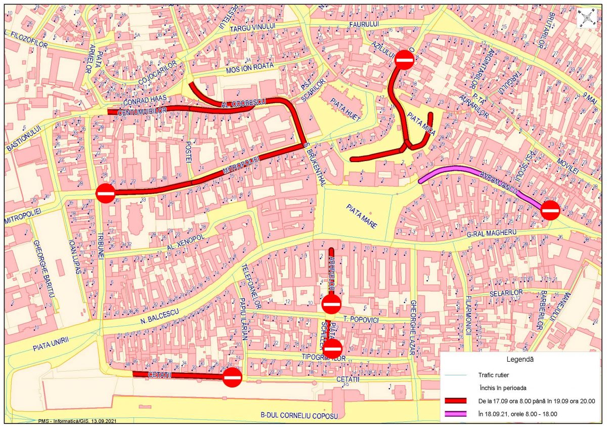 De asemenea, strada Avram Iancu va fi închisă traficului între Piața Mare și intersecția cu str. General Magheru, dar doar sâmbătă, 18 septembrie, în intervalul orar 08.00 – 18.00.