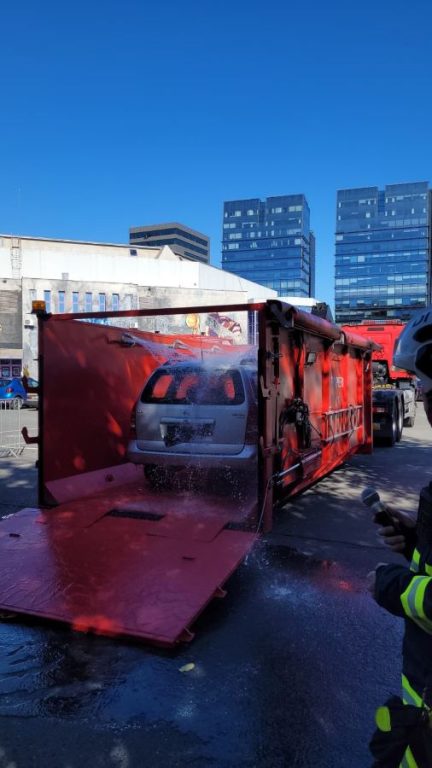 Autovehiculul electric sau hibrid care ia foc este ținut pentru cel puțin 24 de ore în acest container plin cu apă, deoarece riscul reaprinderii autovehiculului se întinde pe o perioadă de 24 de ore. Trebuie spus că pericolul cel mai mare la o mașină electrică sau hibrid este aprinderea bateriei. Sibiul este al doilea județ din România care beneficiază de acest tip de container.
