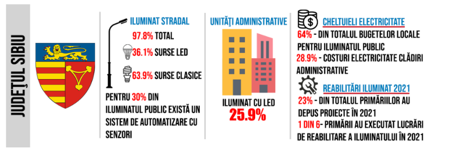 La capitolul „Iluminat stradal”, adică procentul străzilor iluminate din totalul străzilor din județ, Sibiul se află abia pe locul 25 în România, având un procent de aproape 98%. Valoarea poate părea mare, dar este depășită de 24 de județe, unele având chiar și 100% din străzi iluminate public. La capitolul „Iluminat stradal cu LED”, locul ocupat la nivel național de județul Sibiu este și mai slab, 29, deoarece doar 36,1% din iluminatul public este cu LED, din care cele mai multe instalații de acest fel sunt în municipiul Sibiu. Nici măcar pentru iluminarea clădirilor administrative, care consumă foarte multă energie, nu s-au consumat eforturi prea mari, locul ocupat la nivel național fiind tot 29, iar procentul și mai slab: 25,9%.