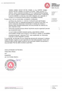 „Certificatul de urbanism nr. 2128 din 10.09.2018 emis de Primăria Municipiului Sibiu nu respectă prevederile aferente PUG Sibiu, iar pentru realizarea obiectivelor menționate în cererea de emitere a acestuia este necesară elaborarea unei documentații de urbanism de tip plan urbanistic zonal. Intervenția propusă produce efecte importante asupra organizării parcelei sau funcționării zonei. Nu sunt create condițiile necesare pentru o dezvoltare unitară, armonioasă a întregii zonei și în relație cu vecinătățile. Procedura propusă – elaborare PUD -este neadecvată, iar intervenția propusă nu este integrată în context”, a transmis președintele filialei Sibiu – Vâlcea a Ordinului Arhitecților din România.