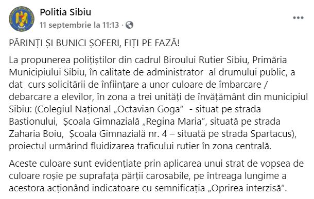 Noua măsură luată de Primăria Sibiu și Poliția Rutieră se dovedește a fi ineficientă, încă din prima zi de școală. Dacă la prima ora a dimineții utilizarea corectă a benzii speciale de debarcare/îmbarcare a fost supravegheată de polițiști, pe parcursul zilei lucrurile s-au întors la situația de dinainte.