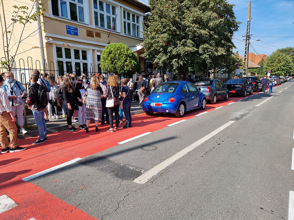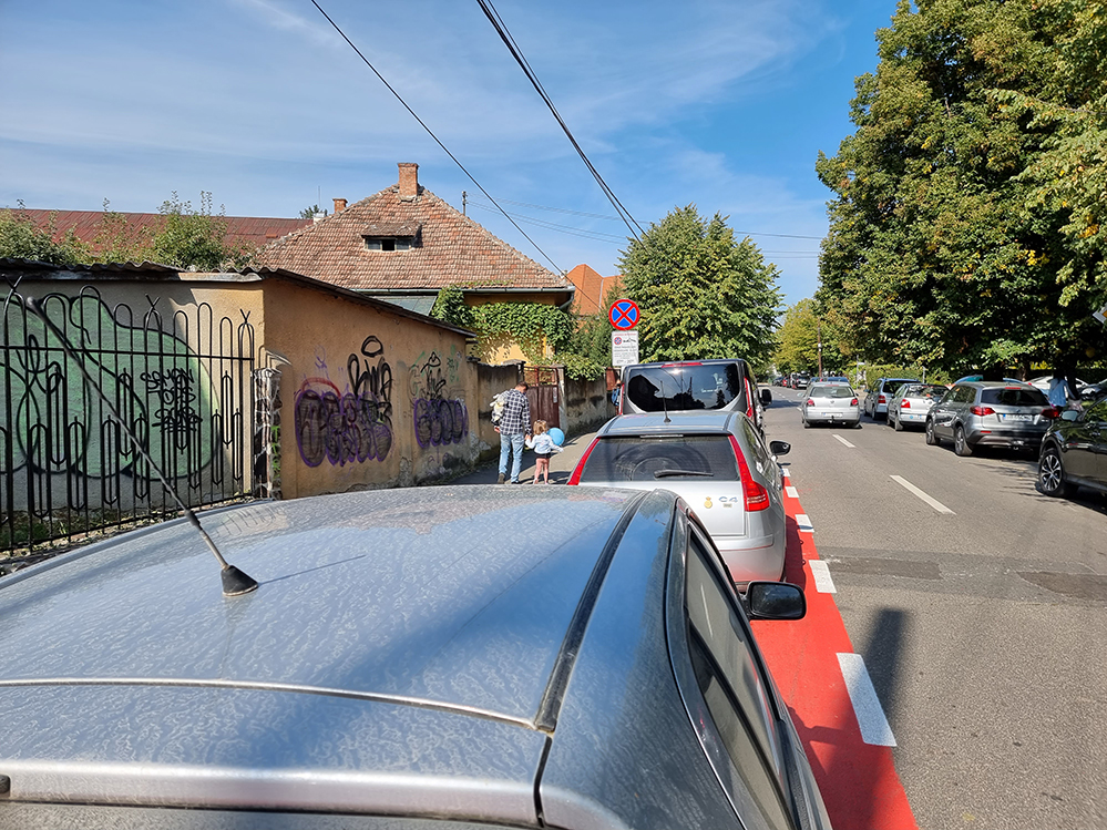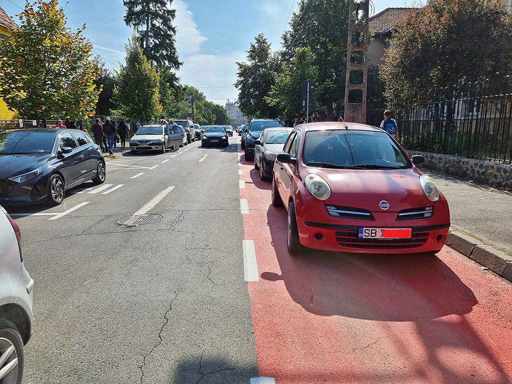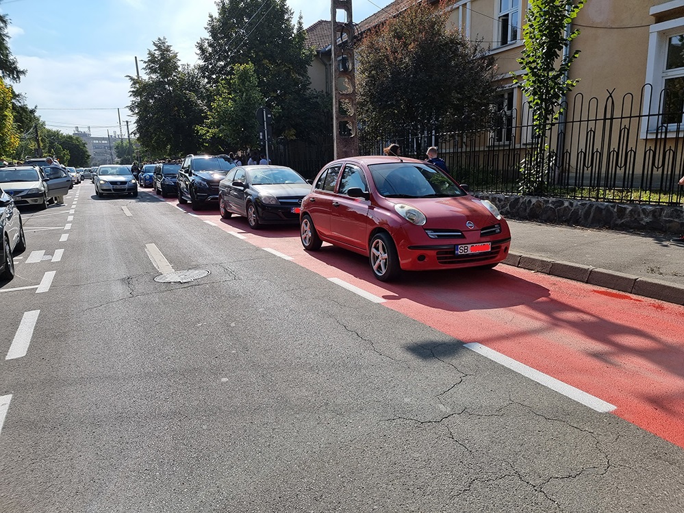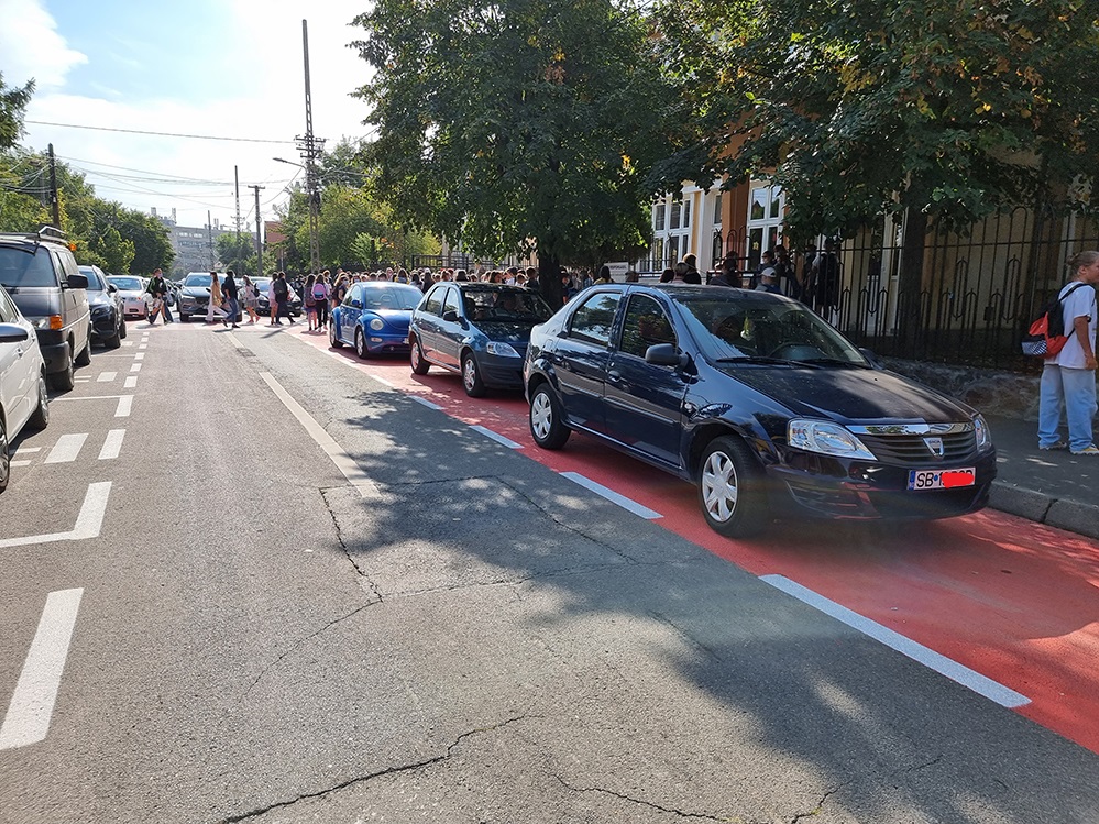 Sibienii cu copii la școală nu reușesc să înțeleagă rostul benzii speciale de îmbarcare și debarcare copii, preferând să parcheze nestingheriți pe această bandă. Acest lucru este posibil și pentru că poliția se dovedește incapabilă să mențină o regulă simplă rutieră.