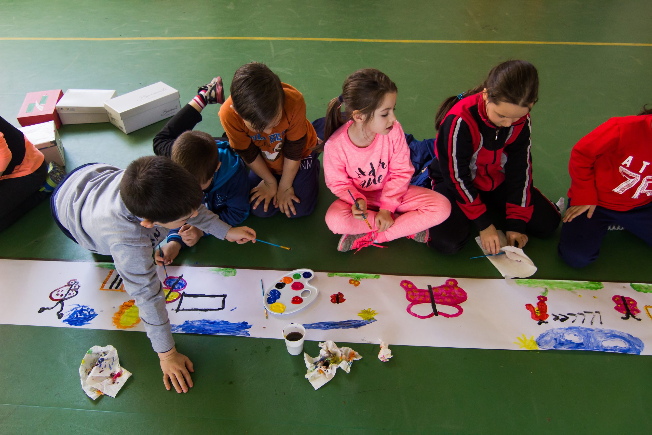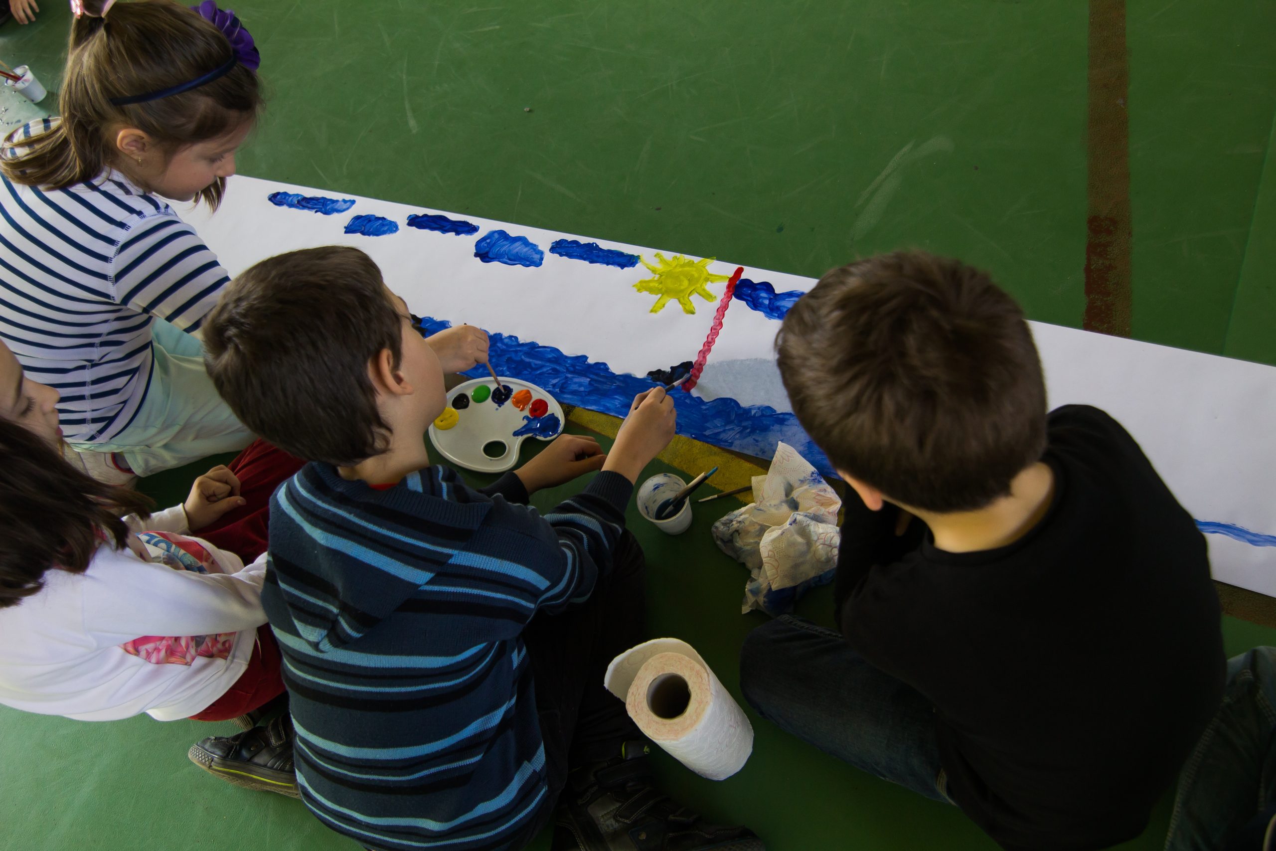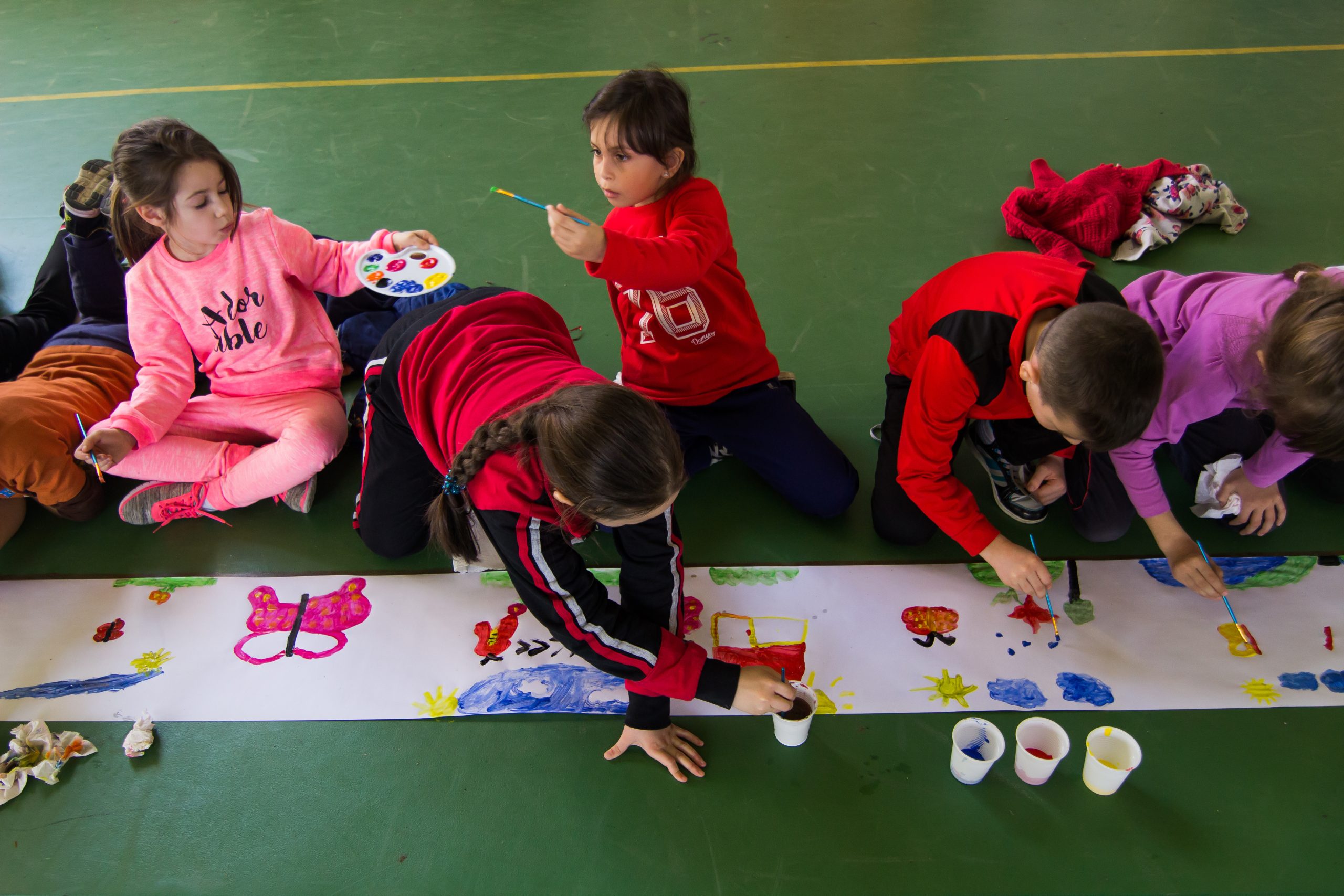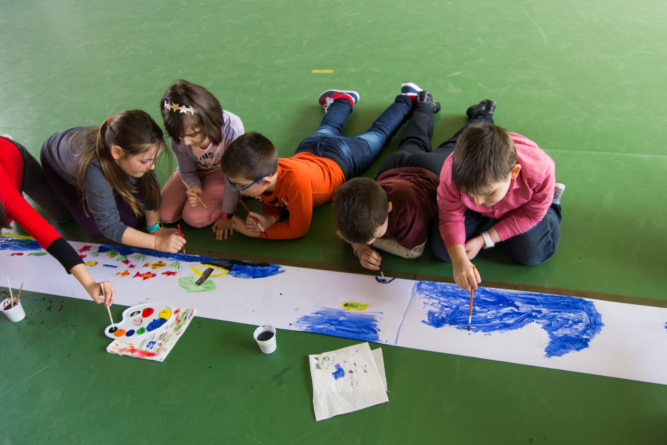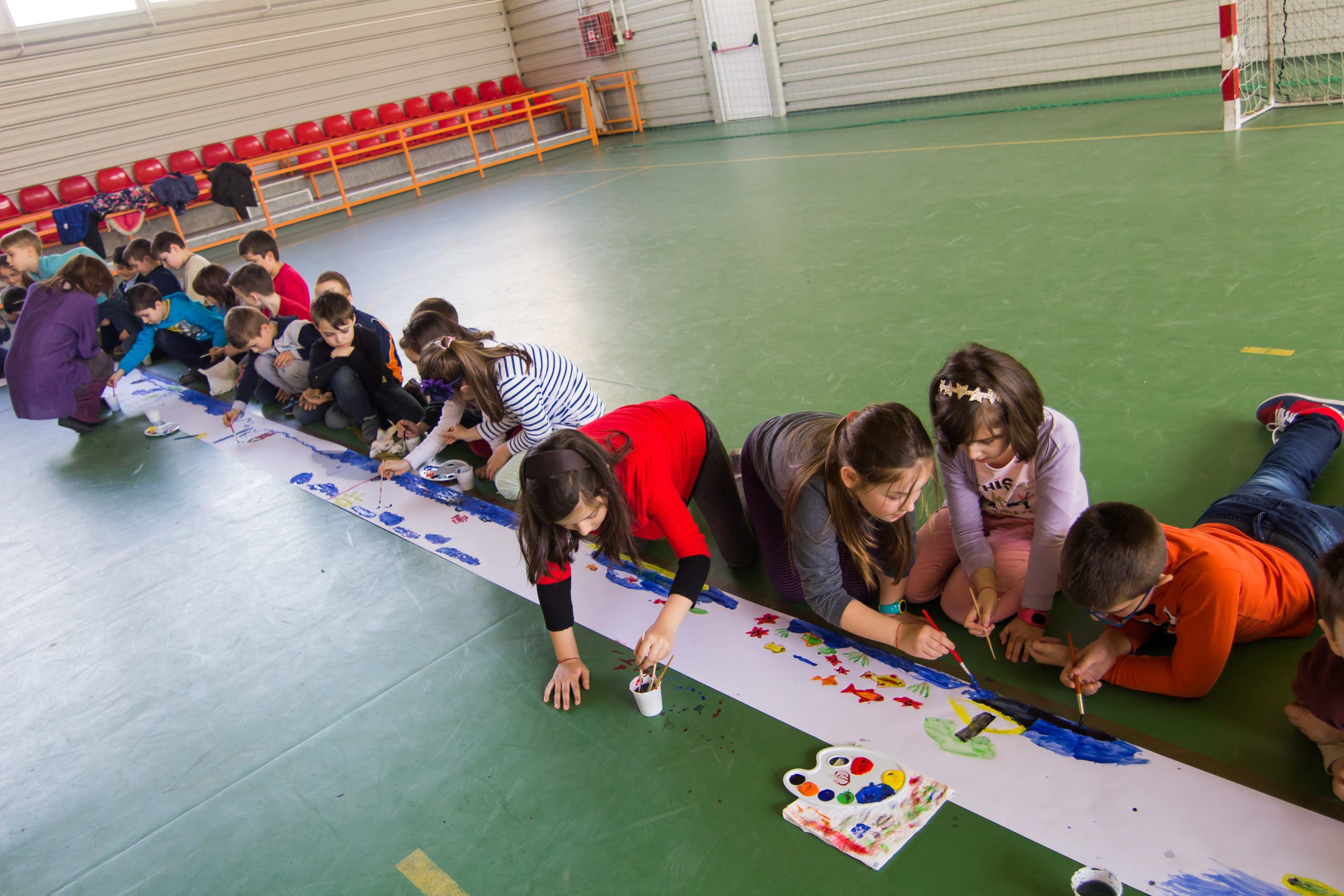 Sala de sport a Școlii Generale nr. 18 din Sibiu a găzduit marți, 21 martie, elevii a cinci clase din ciclul primar care au realizat cea mai mare pictura închinată lichidului vital – apa.