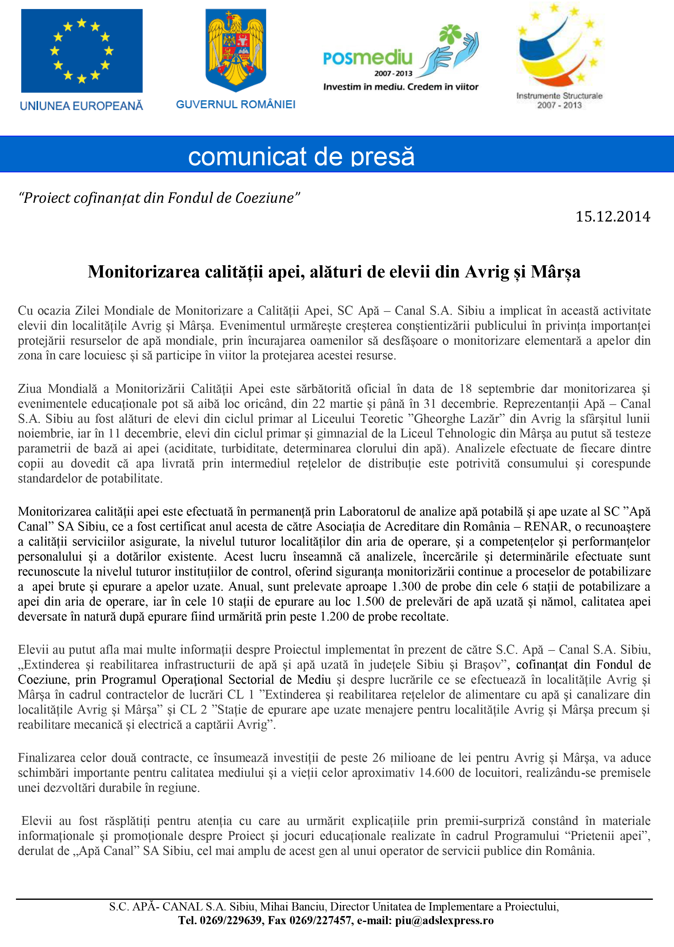 Proiect APA-CANAL: Monitorizarea calității apei, alături de elevii din Avrig și Mârșa