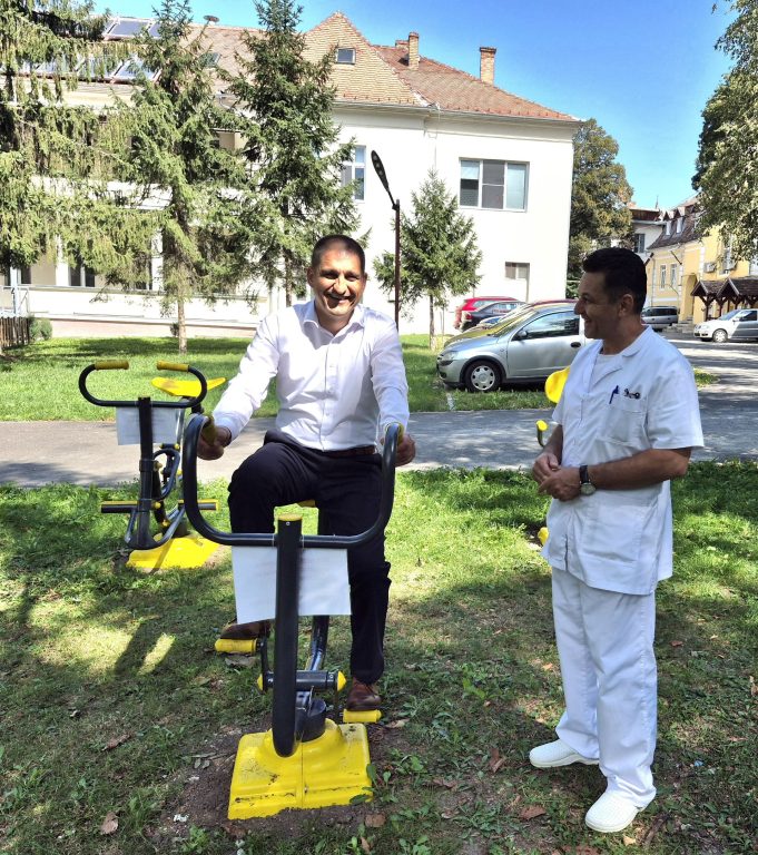 „Prin intermediul acestor aparate de fitness în aer liber voi lucra cu pacienții atât exerciții pentru dezvoltarea forței membrelor inferioare, cât și pentru dezvoltarea forței membrelor superioare, în vederea îmbunătățirii rezistenței la efort și pentru o calitate a vieții mai bună”, spune Adrian David, kinetoterapeut.