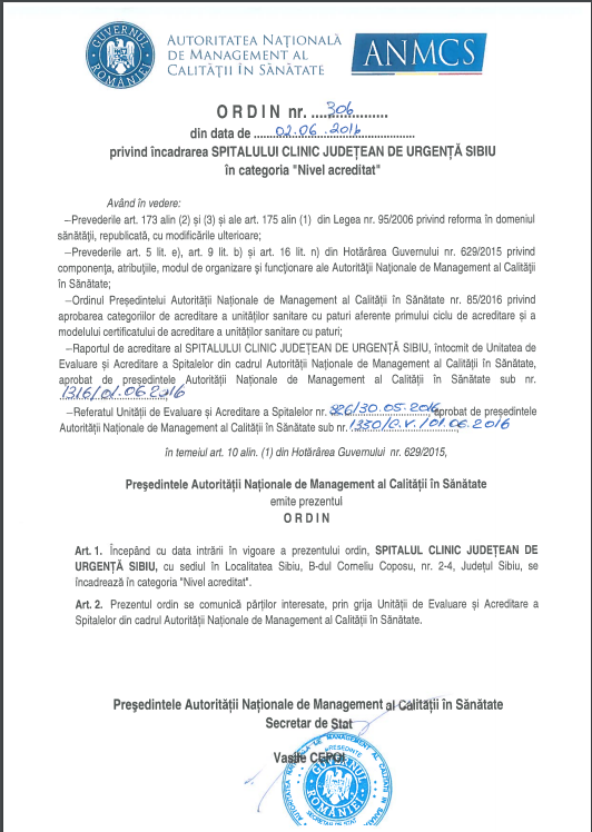 Începând de la data intrării în vigoare a ordinului menționat, SCJU Sibiu se încadrează la categoria “Nivel Acreditat” pentru o perioadă de 5 ani, până în iunie 2021.