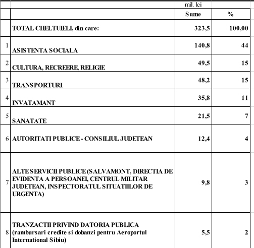 Cea mai mare parte din buget, 140,8 milioane de lei, reprezentând 44%, se vor cheltui pe Asistența Socială, urmată de Cultură cu 49,5 milioane de lei, Transporturi cu 48,2 milioane lei, Invățământ 35,8 milioane lei, Sănătate 21,5 milioane lei, Autorități publice 12,4 milioane lei, Alte servicii 9,8 milioane lei, Datorii 5,5 milioane lei.