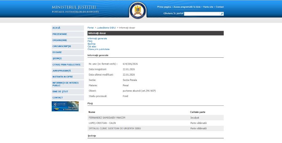 Joi, 22 ianuarie, pe rolul Judecătoriei Sibiu a fost înregistrat dosarul penal nr. 634/306/2026, prin care Fernandez Samodaiev Makcim e trimis în judecată, ca inculpat, pentru purtare abuzivă. Spitalul Clinic Județean de Urgență s-a constituit, alături de Cristian Lupeș, Managerul Filarmonicii, în parte vătămată.