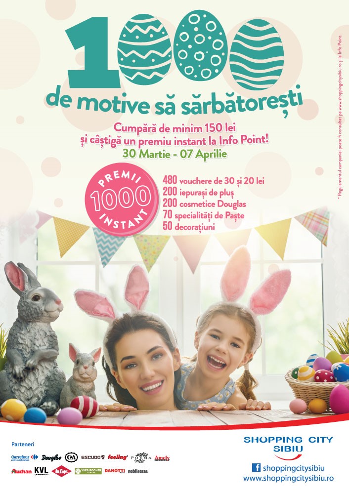 Sibiu, 29 martie – Shopping City Sibiu dă startul campaniei de Paște pentru vizitatorii săi. Începând de mâine și până în Ajunul Învierii, cumpărăturile din centrul comercial pot aduce noi ocazii de shopping. Nu mai puțin de 1.000 de premii instant au fost pregătite de către Iepurașul de Paște, aproape jumătate sub formă de vouchere de cumpărături.