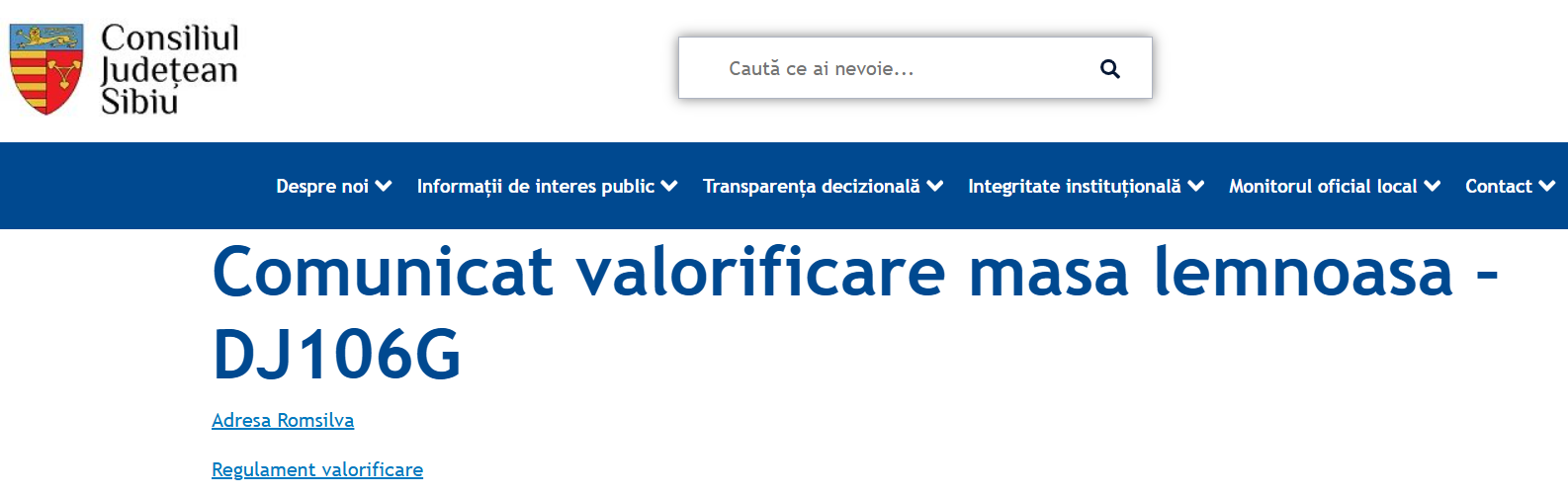 Consiliul Judetean Sibiu anunta intentia de a valorifica prin licitatie in plic inchis 54,95 mc masa lemnoasa pe picior existentă pe amplasamentul DJ 106G, în ampriza drumului județean, în extravilanul comunelor Apoldu de jos și Ludoș.