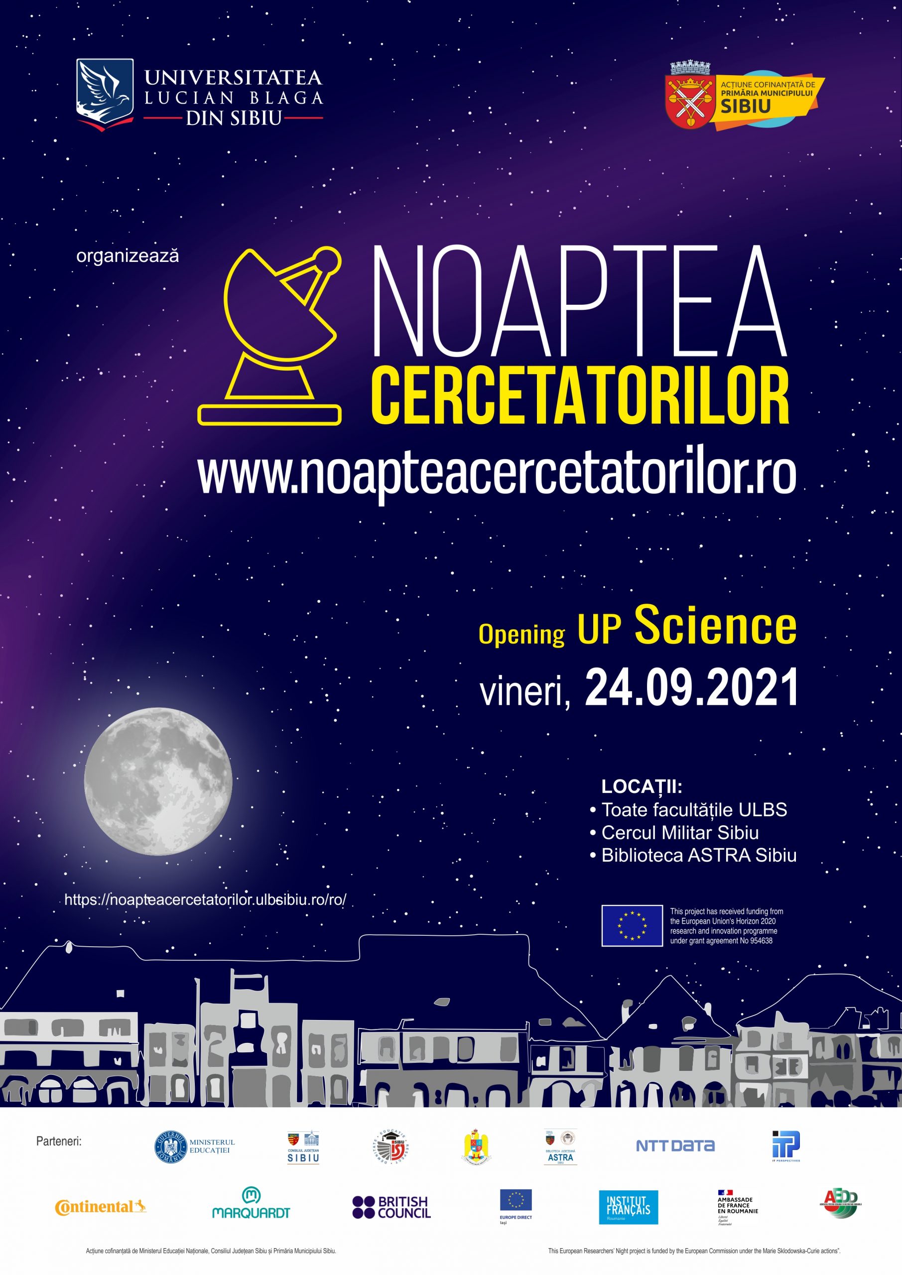 Evenimentul Noaptea Europeană a Cercetătorilor din 2021 își propune să celebreze știința, cea care a facilitat progresul și deschiderea lumii. Dacă anul 2020 poate fi definit prin cuvântul „Lockdown”, sperăm să definim anul 2021 prin conceptul „Opening Up”. Atribuim cercetării o contribuție semnificativă pentru întoarcerea la normalitate. Niciodată în istoria umanității impactul științei asupra vieții noastre nu a fost mai clar și mai rapid. Subliniem astfel rolul cheie pe care îl va juca cercetarea într-o recuperare sustenabilă post-Covid, un proces care va permite societăților să avanseze către un viitor mai curat, mai durabil, neutru din punct de vedere al „amprentei carbonului”.