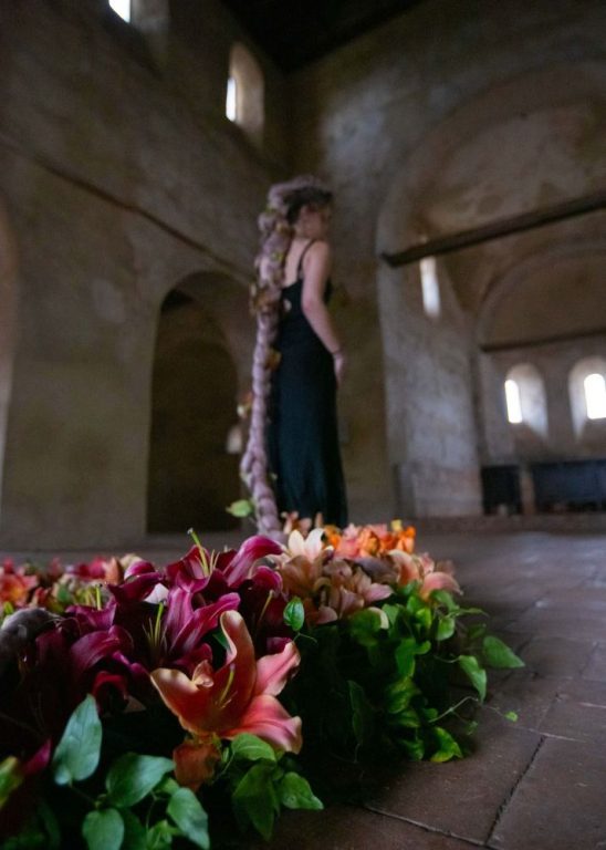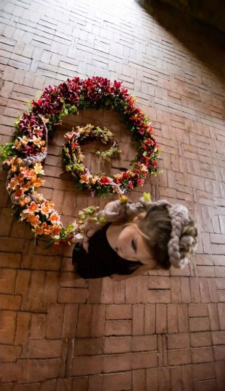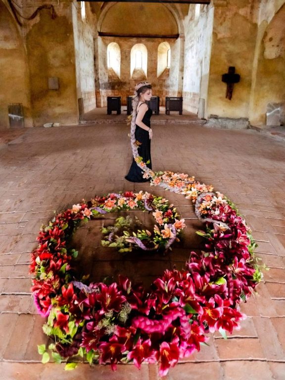Ce a făcut Ioana la Cisnădioara nu a fost doar un decor frumos. A fost o intervenție artistică într-un loc plin de istorie. Cetatea, cu zidurile ei masive și pietrele reci, a devenit fundalul perfect pentru fragilitatea florilor și povestea imaginată de Ioana. Contrastele – masiv versus efemer, trecut versus prezent, geometria zidurilor versus fluiditatea plantelor – au creat o tensiune specială ce a ridicat totul la nivel de instalație artistică. Fiecare floare, fiecare fir părea să spună ceva, să transmită o vibrație, o poveste. Impresia generală? Parcă priveai o creatură mitică – o preoteasă a naturii, o muză prinsă între realitate și vis.