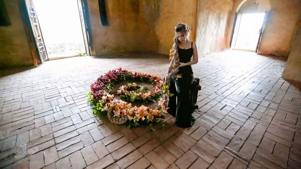Lucrarea Ioanei, deja virală în poze pe internet, te smulge din realitatea și te face să visezi cu ochii deschiși despre o lume fantastică. În mijlocul cetății Cisnădioara, apare o figură feminină cu o coafură care parcă sfidează gravitația: părul împletit într-un stil arhitectural, prelungit într-o coadă lungă făcută doar din flori naturale. Totul arată ca dintr-o poveste, de parcă vezi un personaj mitic care poartă natura ca pe o parte din sine. Modelul — chiar fiica Ioanei, același model care i-a stat alături și când artista câștiga același concurs în 2020.