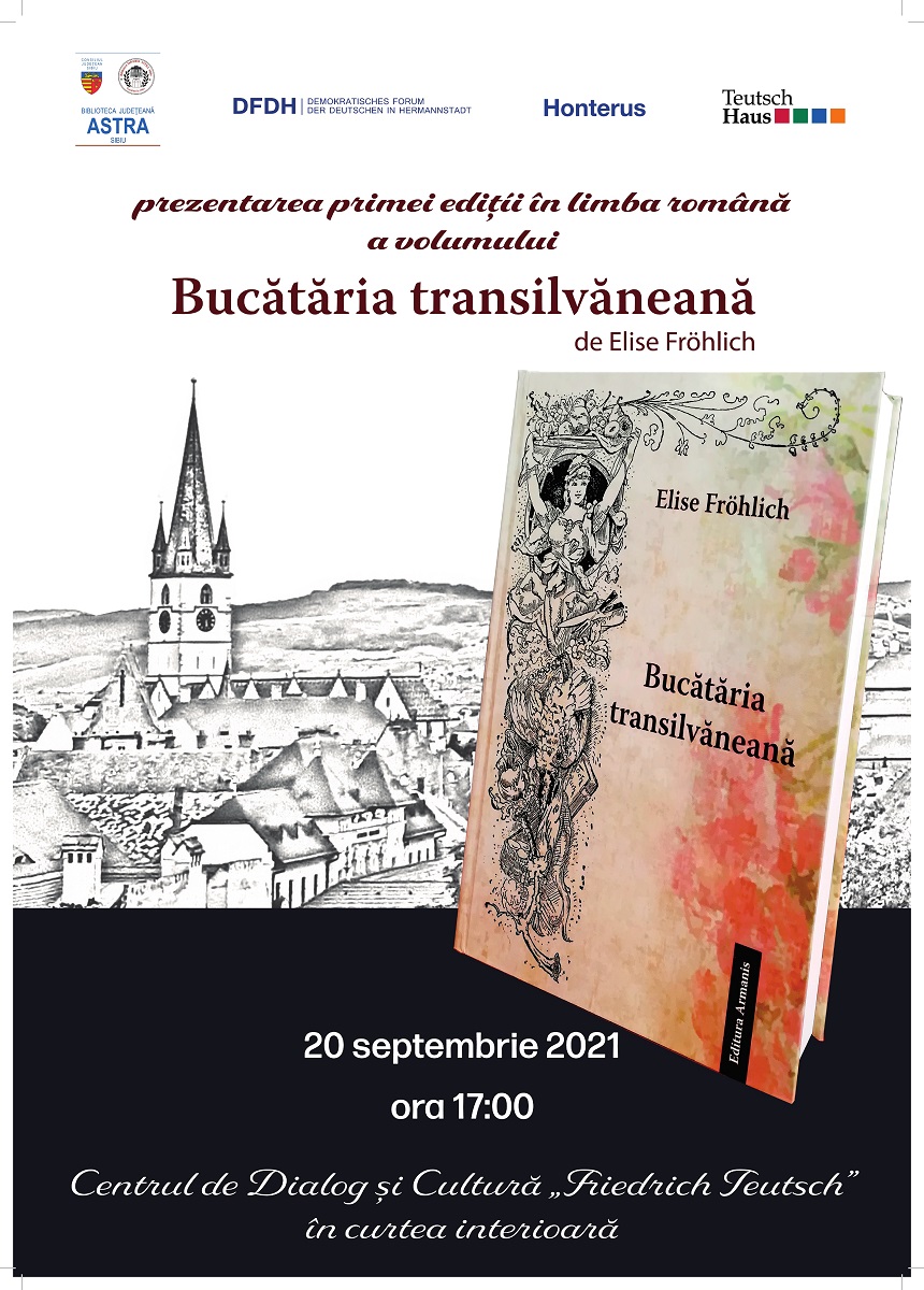Centrul de Dialog și Cultură „Friedrich Teutsch” din Sibiu va găzdui pe 20 septembrie o importantă lansare de carte din domeniul culinar. Este vorba despre „Bucătăria transilvăneană” de Elise Fröhlich, publicată de Editura Armanis a Bibliotecii Județene ASTRA Sibiu, în traducerea Ruxandrei Stănescu. Cartea este ediția în linba română a unei lucrări de o importanță semnificativă pentru gastronomia transilvăneană și, în mod particular, sibiană, ea fiind extrem de căutată de pasionații de bucătărie tradițională săsească și transilvană, cuprinzând rețete culinare de la sfârșitul secolului al XIX-lea și începutul secolului XX.