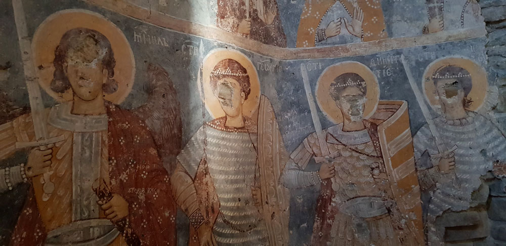 În interior, se pot descoperi stâlpii îmbrăcați în vechi picturi care ilustrează Sfânta Treime cu Iisus îmbrăcat în straie populare, pe Sf. Marina care se luptă cu diavolul și pe Sf. Toma care își poartă pielea în băț. Deși picturile au fost vandalizate de cotropitorii turci și de către calvini, care le-au acoperit cu var, acestea rezista în timp, iar imaginea regăsita este astăzi una plină de mister.