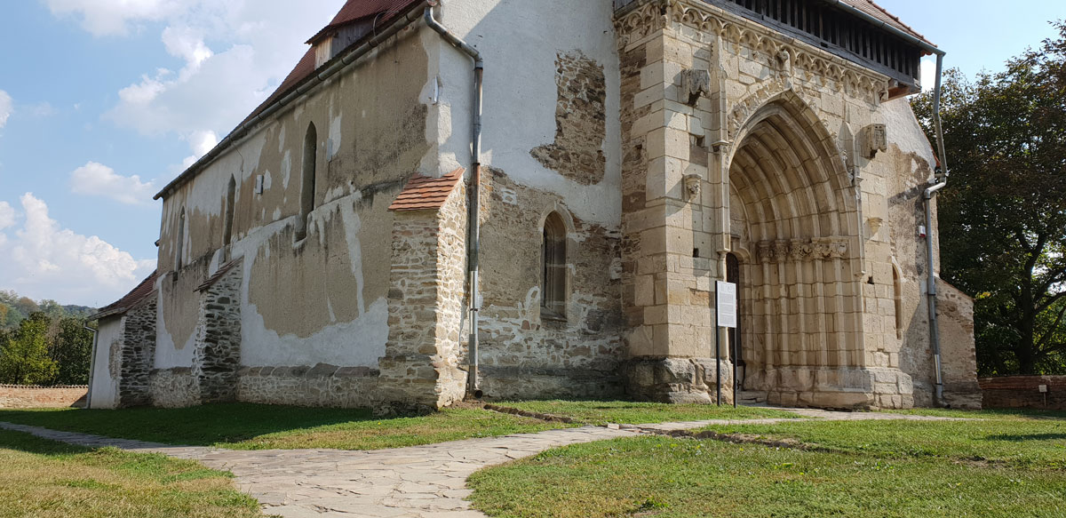 Odată ajunși aici, veți observa arhitectura specifică bisericilor fortificate din zonă și este inevitabil să nu vă opriți vreme de câteva minute în fața portalului de vest, cu 5 coloane și arhivolte. Acesta este decorat cu sculpturi în piatră realizate între anii 1420-1530, ilustrând animale, capete de oameni, ciorchini de struguri și alte motive vegetale. Cea de-a doua poartă de intrare, mai mica în dimensiuni este și ea frumos decorată.