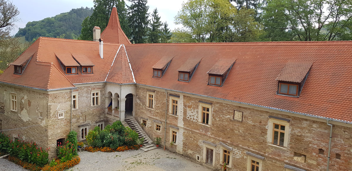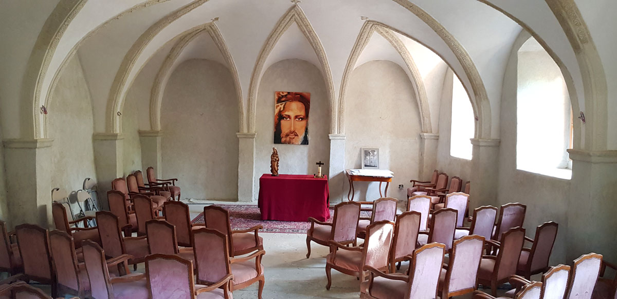 Intrarea principală adăpostește capela, una dintre cele mai frumoase incinte ale reședinței nobiliare, cu ornamente renascentiste și bolți gotice.