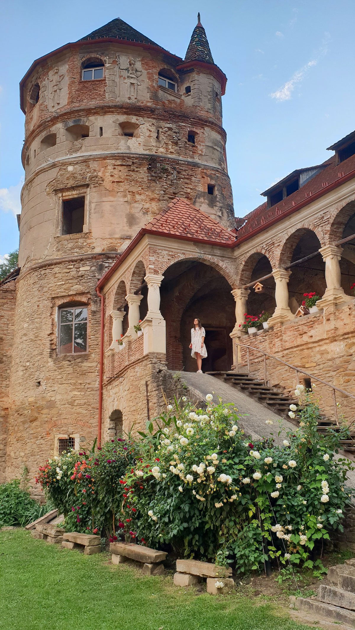 Cadrul de basm este conturat de turnul circular poziționat in partea dreaptă a ansamblului, impozanta scara cu balustrade dar și de logia cu 15 coloane din piatră și deschideri arcuite.
