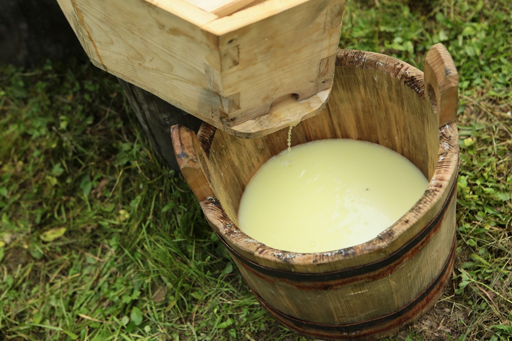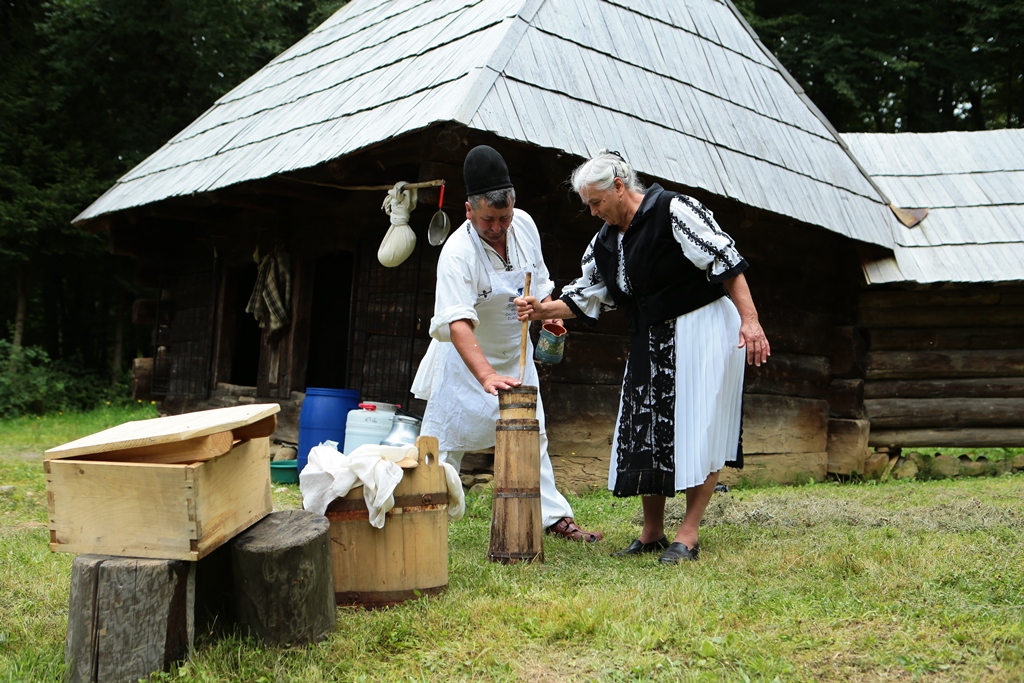 Ciobanii din Răşinari prepară unt, jintiţă şi caş din lapte de oaie, după metode tradiţionale, în Muzeul ASTRA