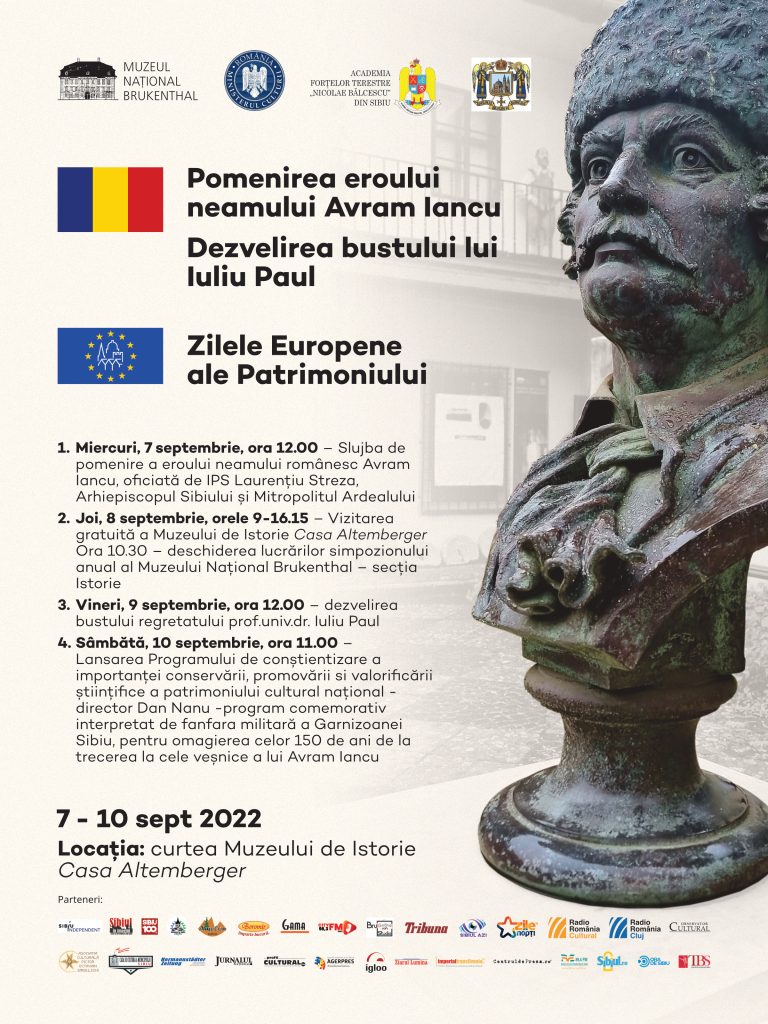 ”În acest an, cu prilejul împlinirii a 150 de ani de la trecerea în veșnicie a omului politic, revoluționarului și eroului neamului românesc Avram Iancu și cu prilejul Zilelor Europene ale Patrimoniului, Muzeul Național Brukenthal a pregătit o serie de evenimente care vor debuta în data de 7 septembrie, cu slujba de pomenire a lui Avram Iancu în fața bustului său amplasat în curtea Muzeului de Istorie – Casa Altemberger din Sibiu, slujbă oficiată de IPS Laurențiu Streza, Arhiepiscop și Mitropolit urmată joi de lucrările simpozionului național de istorie; vineri, 9 septembrie, va avea loc dezvelirea bustului istoricului și profesorului Iuliu Paul tot în curtea Muzeului de Istorie – Casa Altemberger iar sâmbătă va avea loc un spectacol de muzică susținut de Muzica Garnizoanei Sibiu și lansarea Programului de conștientizare a importanței conservării, promovării si valorificării științifice a patrimoniului cultural național, susținut de domnul Dan Nanu, director DJC Sibiu. Joi, 8 septembrie, Muzeul de Istorie – Casa Altemberger și expoziția Academia Fortelor Terestre 175 de ani de învățământ militar românesc vor putea fi vizitate în mod gratuit în intervalul orar 9-16:15. Cu acest prilej, îi invităm pe toți sibieni să participe la aceste adunări publice prilejuite de o serie de evenimente istorice și culturale”, a declarat Alexandru Constantin Chituță, șeful secției Educație, Marketing și Comunicare din cadrul Muzeului Național „Brukenthal”.