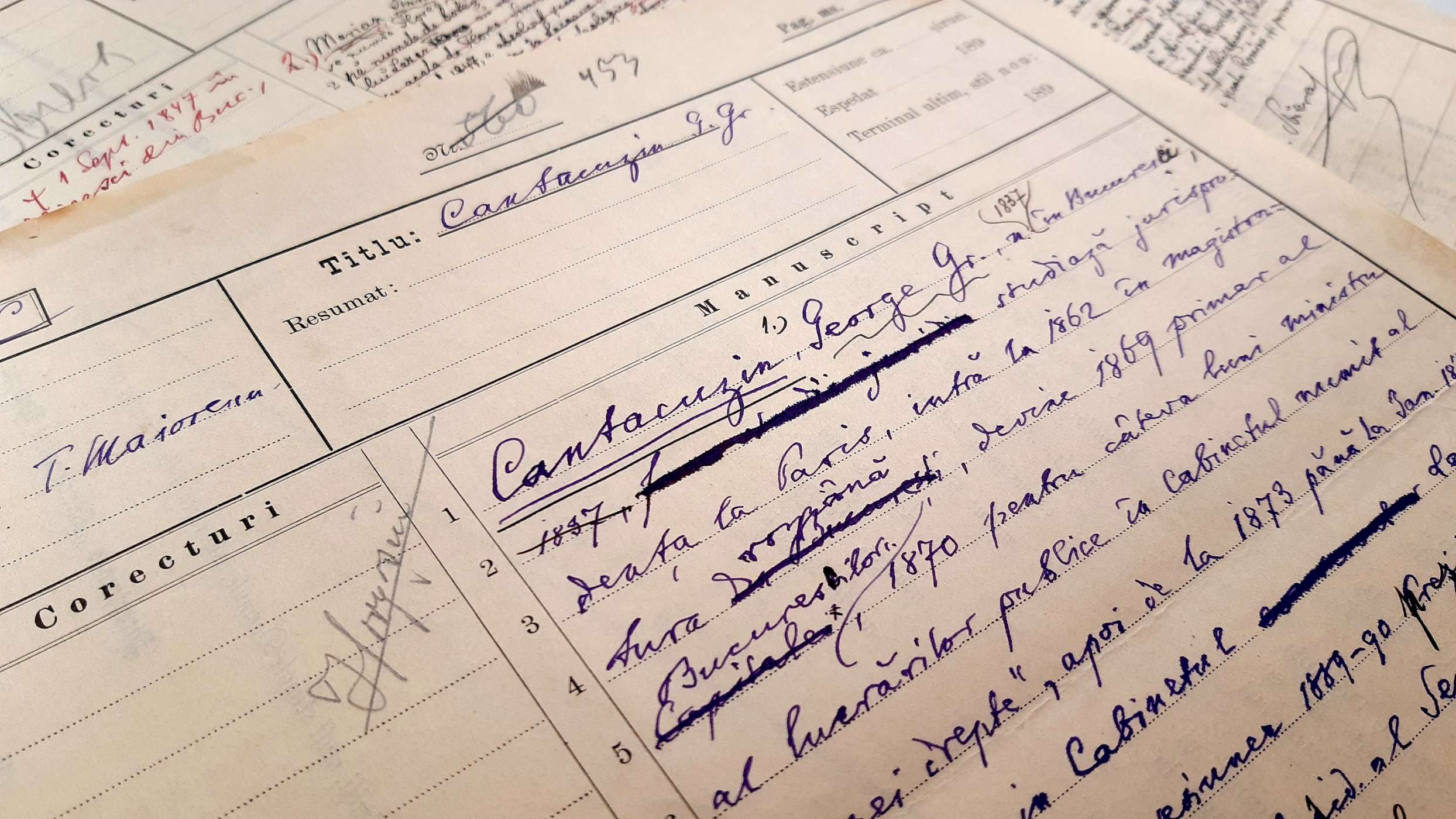 Conform organizatorilor, expoziția se adresează pasionaților de istorie și cuprinde: formulare tipizate reprezentând apeluri către reprezentanții intelectualității românești care erau solicitați să contribuie cu materiale la realizarea primei Enciclopedii a României; declarații ale celor care au acceptat să fie cooptați și să transmită contribuții pe domeniile proprii de activitate: Elie Cristea (literatură germană și română, istoria Bisericii Ortodoxe), Vasile Bologa (pedagogie), Ioan Bogdan (literatură română veche), Iosif Vulcan (articole de presă literară), Simion Mehedinți (geografie și etnografie), Constantin Rădulescu-Motru (filozofie, psihologie și psihiatrie), A.C. Cuza (drept constituțional, politică); fișele Enciclopediei elaborate de cei care s-au angajat să își transmită contribuțiile în vederea elaborării acestei ample lucrări: Dimitrie Onciu – Istoria Făgărașului, Augustin Bunea – biografia lui Ioan Inocențiu Micu Klein, Ion G. Sbiera – Familia Hurmuzaki, Ilarion Pușcariu – Sava Brancovici, Titu Maiorescu – George Grigore Cantacuzino și Petru Mavrogeni.