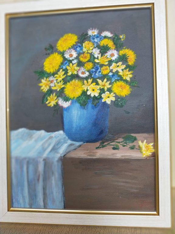 „Mama era bolnavă și i-am pictat un tablou cu crizanteme, care să-i amintească de vremurile când avea aceste flori în grădină. S-a bucurat enorm, iar pe mine m-a motivat să continui”, spune septuagenara al cărei tonus nu poate fi trecut ușor cu vederea.