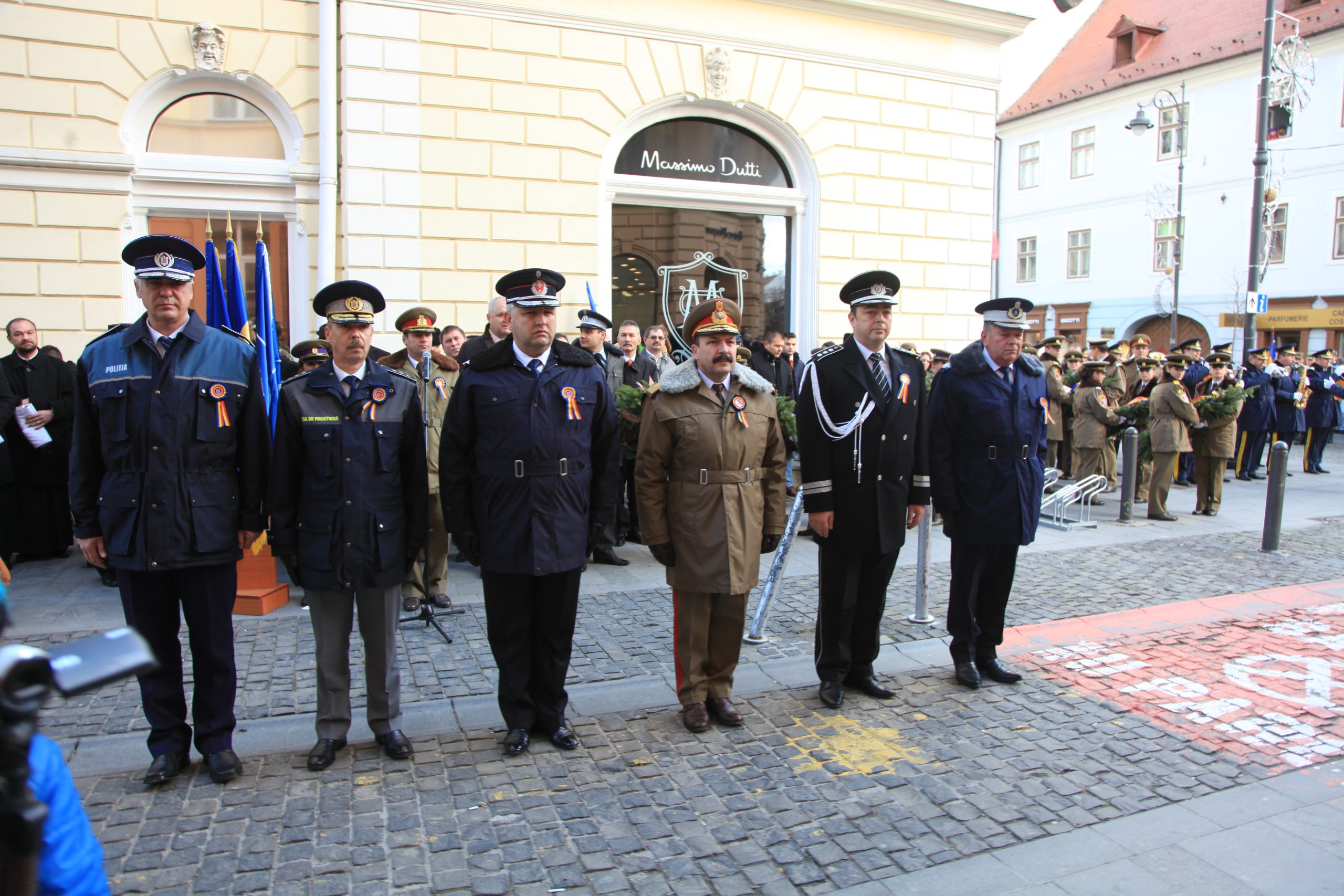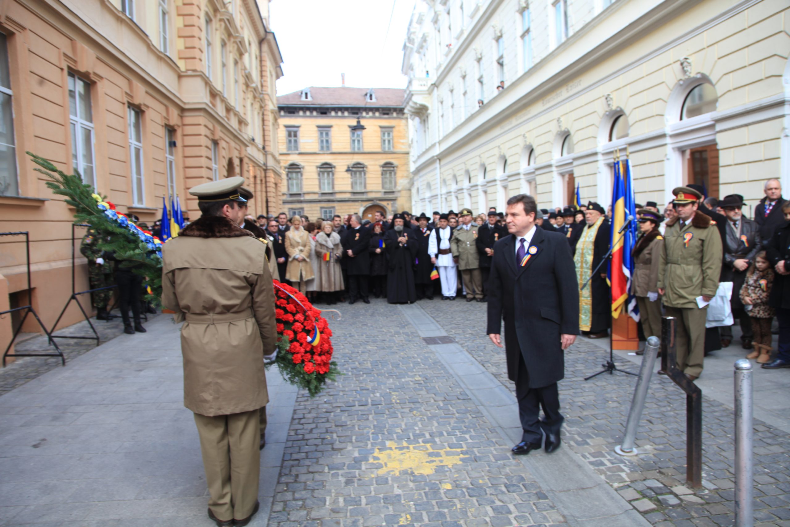 Al doilea mare eveniment dedicat la Sibiu zilei de 1 decembrie a fost depunerea de coroane la Consiliul Dirigent de pe Bulevardul Nicolae Bălcescu. Conform protocolului, prefectul judeţului, Ovidiu Sitterli, a fost primit de garda de onoare, pe care a salutat-o.