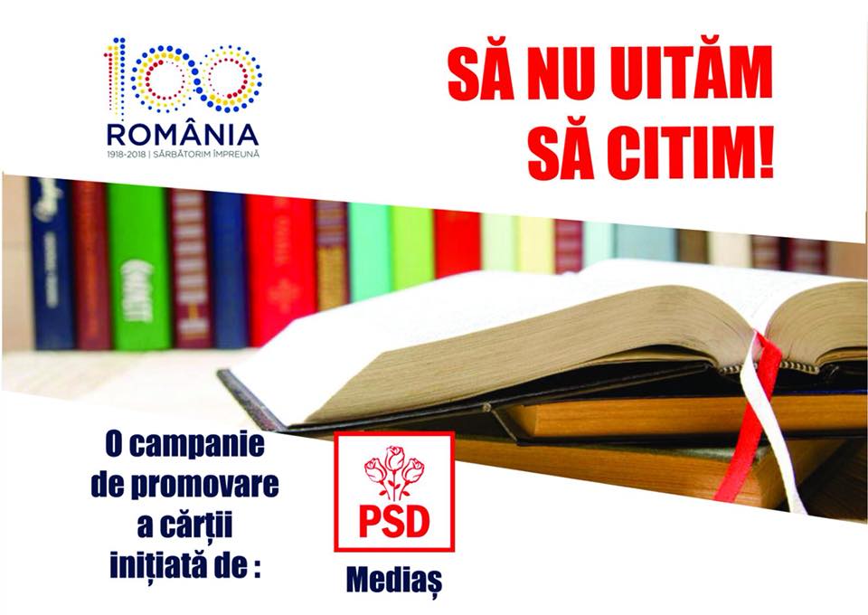 „Să nu uităm să citim” a fost motto-ul sub care, joi după amiaza, membrii Partidului Social Democrat Mediaș au desfășurat o acțiune de donare de cărți. Social democrații medieșeni au fost prezenți în diferite zone din oraș și le-au oferit trecătorilor peste 130 de volume, încurajarea cititului fiind scopul principal al acțiunii. Reprezentanții Partidului Social Democrat Mediaș susțin că săptămâna a debutat cu Ziua Internațională a Cărții, iar organizația locală a dorit să încurajeze lectura în rândul medieșenilor. Aceștia mai spun că este un pas mic, însă prin această acțiune, în Anul Centenarului Marii Uniri își doresc să promoveze literatura română, un element definitoriu al identității naționale.