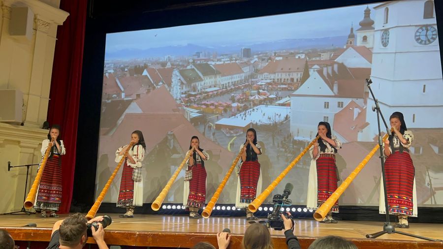 Evenimentul a început cu un mic moment artistic, interpretat de „Tunicăresele Moațele din Apuseni”, după care a luat cuvântul prezentatoarea Amalia Enache: „E un sunet care ne este foarte drag aici, la Sibiu, sunetul tulnicelor. Un sunet care vine după atâtea zile în care, în documentare, am văzut destul de multe imagini nu tocmai prietenoase, cu fețe ale lumii în care trăim. E un sunet (al tulnicelor) pe care îl preferăm, nu al războiului, spre exemplu.