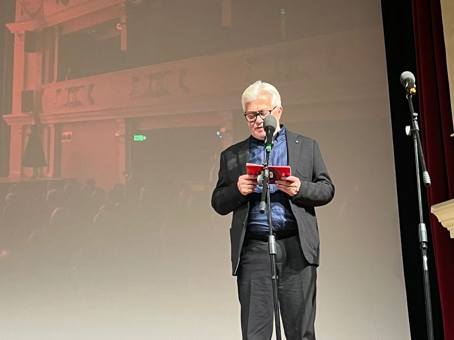 Au fost în această ediție de festival cinci documentare despre război, un prilej foarte bun pentru mine să-i salut pe studenții Academiei Forțelor Terestre, prezenți în sală, vă rog să-i aplaudați. Ei sunt studenți aici, la Sibiu, și mi se pare foarte frumos că jumătate din sală este ocupată de ei, mi se pare foarte frumos că au fost invitați. A fost foarte emoționant pentru ei. Înțeleg, au fost invitați la toate cele cinci documentare despre război și la toate discuțiile din jurul acestor documentare. Noi știm despre documentar că ne arată lumea așa cum este ea, doar că selecția oficială a filmelor din acest an, ne-a pus parcă mai direct decât oricând față în față cu lumea așa cum începe ea să devină”.