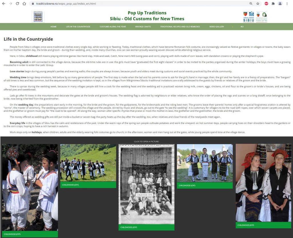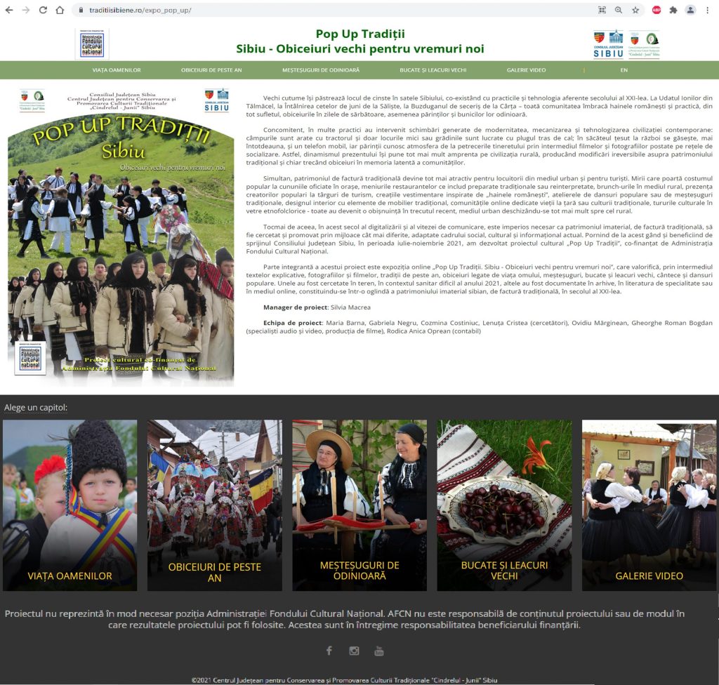 Expoziția online bilingvă „Pop Up Tradiții. Sibiu – Obiceiuri vechi pentru vremuri noi” poate fi vizualizată pe site-ul https://www.traditiisibiene.ro/expo_pop_up/ și mizează, conform organizatorilor, pe multitudinea căilor de comunicare, aducând în prim plan texte, fotografii și imagini video, ilustratuve pentru modul în care tradițiile sunt păstrate în Sibiul contemporan.