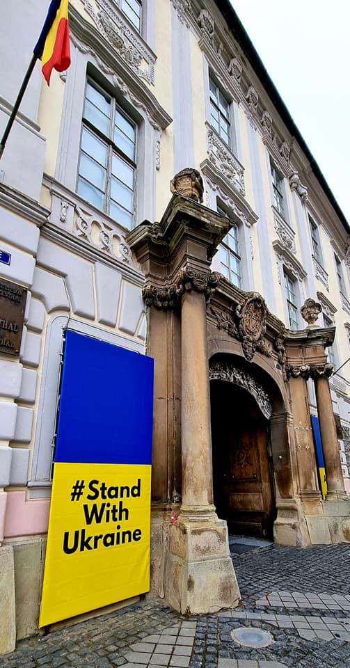 Războiul din Ucraina sensibilizează tot mai mulți oameni și instituții din Sibiu. De astăzi, Muzeul Național „Brukenthal” a afișat mesaje de susținere a țării atacate de Rusia, înfățișând pe clădirea Palatului din Piața Mare steagul Ucrainei.