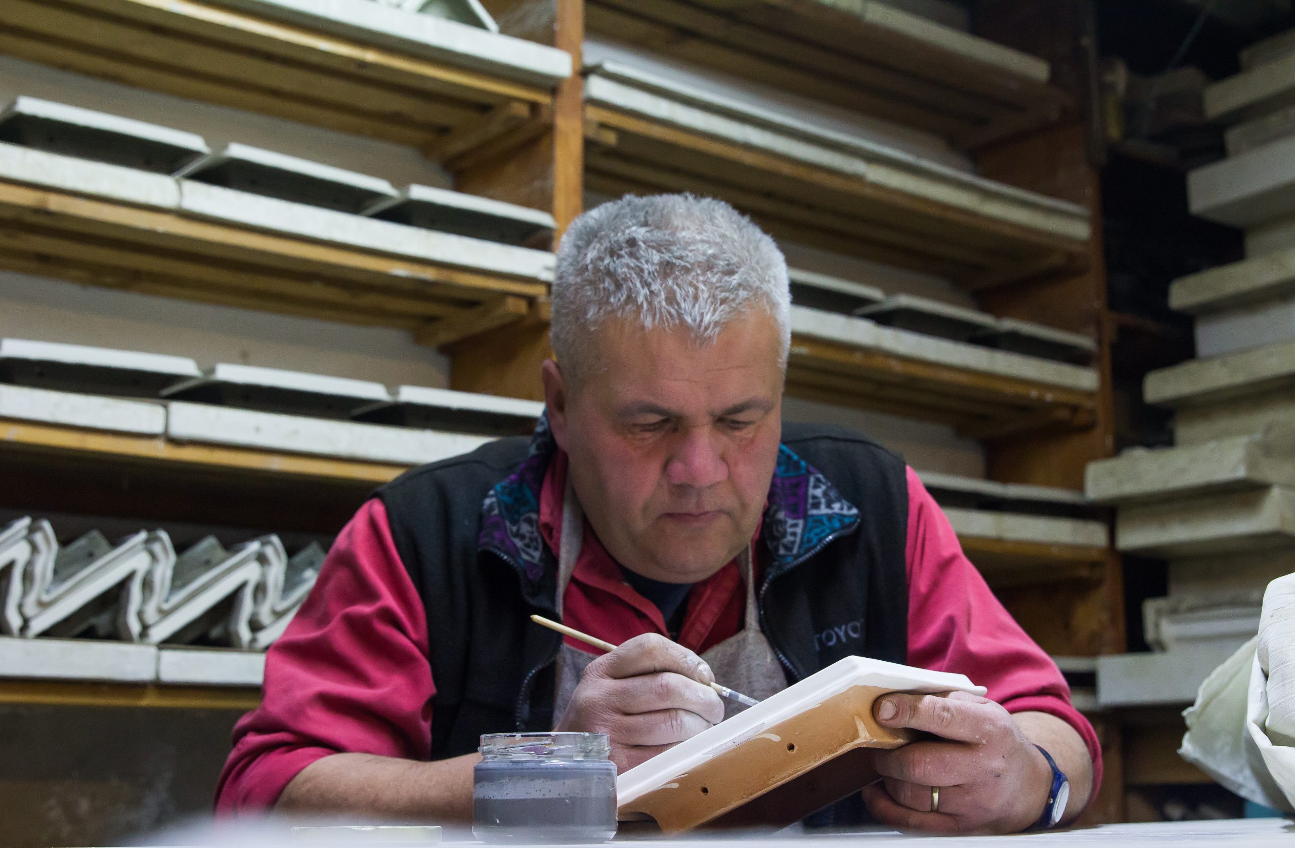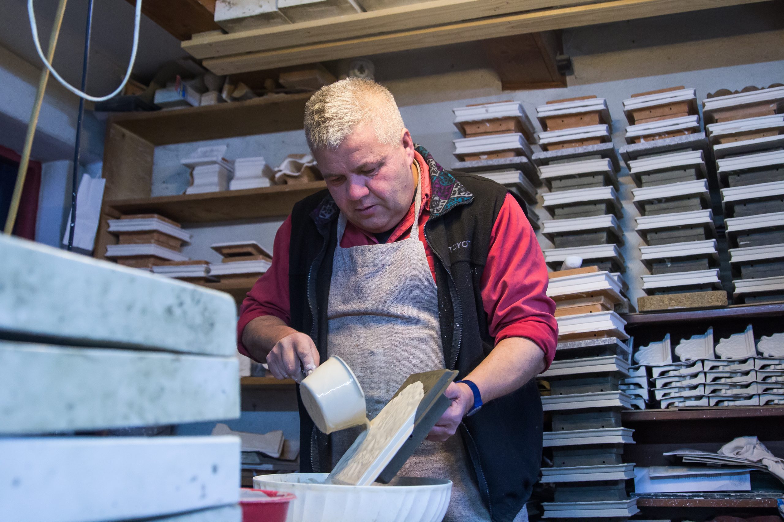 Domnul Henning lucrează singur. Oricum în atelier este loc pentru maxim două persoane. Însă reușește să-și onoreze comenzile. Treaba lui nu este una simplă. Nu face doar cahle drepte, ci și colțuri, cornișe, lateral de cornișe sau socluri. „Pentru fiecare piesă sunt alte forme. Fac o săptămână numai soclu, apoi numai colțuri și tot așa. Este totuși o chestie de serie.”
