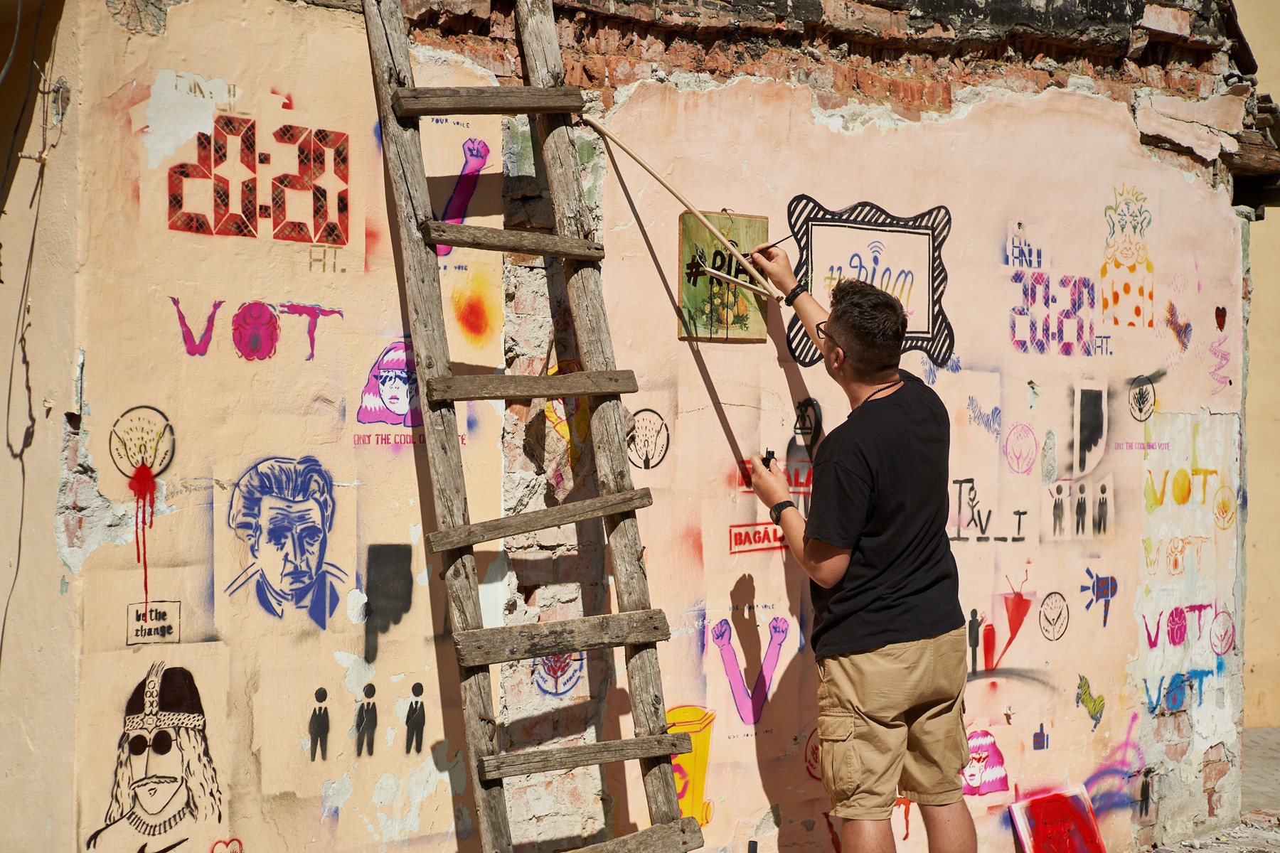 „S-a pus în balanță imaginea artistului vs. producția artistică, mediile on-line vs. galeriile și muzeele tradiționale, pentru a defini (în teorie) noua abordare culturalo-socială pe care o va avea arta în viitorul apropiat. Expoziția pe care am pregătit-o și este expusă în această perioadă în Piața Mică din Sibiu este o expoziție în jurul ideii de vot. Am propus tehnica stencil-ului, cunoscută și sub denumirea de tehnică a șablonului. Majoritatea participanților nu au fost familiari cu această tehnică de multiplicare. Am făcut o scurtă introducere în istoricul ei, apoi le-am explicat procesul de execuție. Fiind majoritatea studenți, masteranzi și absolvenți de facultăți de arte, au prins repede procedeul și s-au adaptat în cele mai creative moduri.”, a spus prof. Mihai Zgondoiu.
