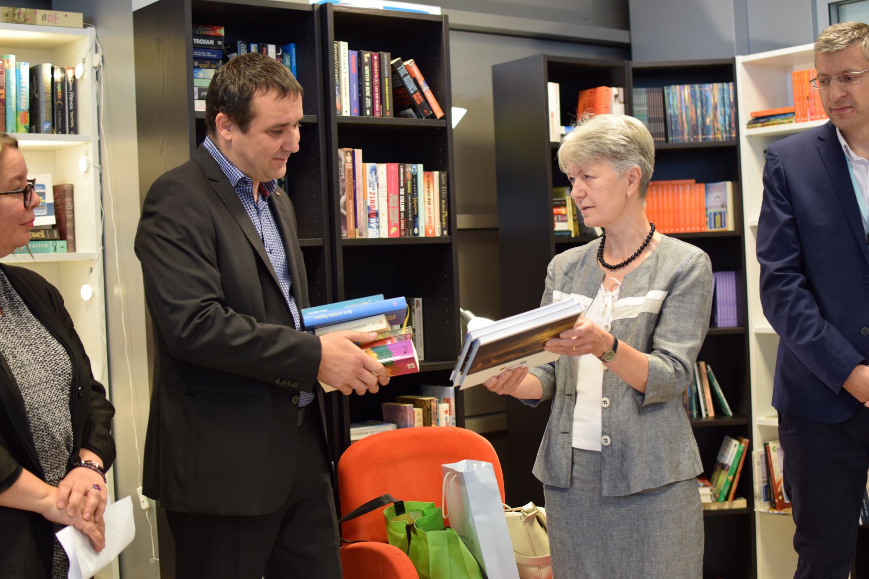 Doamna Christine Manta-Klemens, Vicepreședinta Consiliului Județean Sibiu, pe lângă felicitări și cuvintele de încurajare adresate celor care au creat această oportunitate culturală pentru pasagerii AIS, a donat câteva volume care vor fi integrate în fondul de carte Reader on Board | Cititor la Bord.