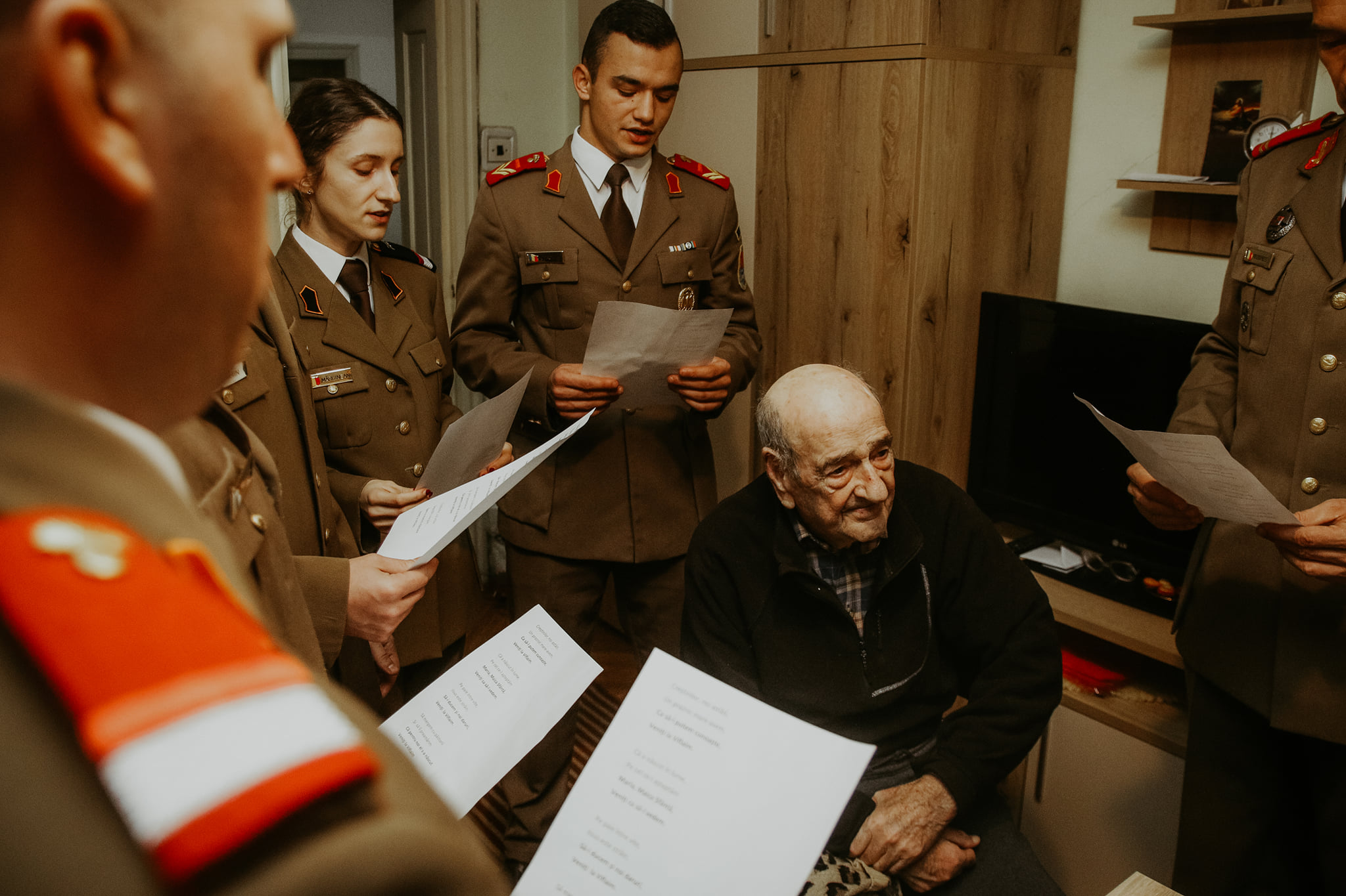 „Au depus coroane în ploaia rece, au fost și brațe și migală, au purtat uniformele războaielor și au purtat de mână veteranii, studenții noștri ca niște flăcări cu lumină albastră. La aplauze au apărut puțini, puțini și fără seamăn de talentați, studenții Cosmin Vălimăreanu, Cristina Corbeanu, Georgiana Suciu, Liviu Nedelcu, Ionuț Herghelegiu și Rareș – Andrei Păuna. Studentei Daria Butoiu îi mulțumim cu o reverență pentru aducerea aminte a celei care a fost Buni Elena, maiorul în retragere Elena Țega, cea care s-a stins la 102 ani, în seara în care bunii noștri studenți împleteau fotografii și munci nevăzute cu lumini de flăcări albastre”, mai transmis col. Adrian Teodorescu.