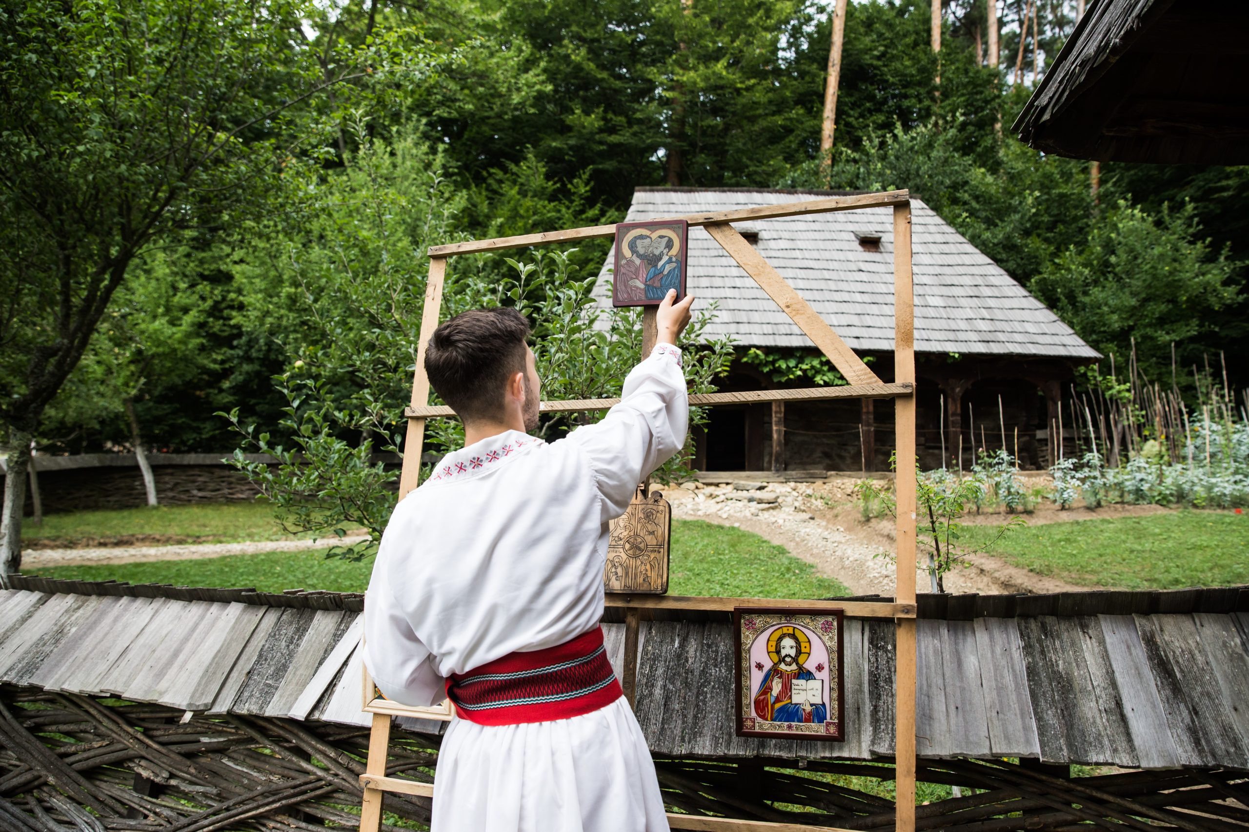 Participanții s-au întrecut la peste 26 de meșteșuguri, dar predominantă a fost pictura icoanelor pe sticlă şi pe lemn și sculptatul icoanelor pe vatră. Pe Ioana Ariana Andrei am găsit-o într-o curte destinată județului Dâmbovița. Este elevă în clasa a X-a și deținătoare a unor locuri I, la concursurile de la Huedin sau Tg. Jiu. Pasiunea pentru pictura pe sticlă a descoperi-o în clasa a V-a, atunci când la școala ei s-a creat o clasă de artă și printr-un examen a intrat! „Trasez pe dosul sticlei, acolo unde construiesc personajele, iar la final le pictez. De obicei respect canoanele, iar profesorii mei spun că îmbin pictura bizantină cu stilul Moreni, zona de unde vin eu și despre care se tot vorbește în ultimul timp”, spune fata. Puțin mai încolo, Călin Daniel Băruț își așază cu grijă tablourile. Are 18 ani, se pregătește de clasa a XII-a și este tot din Moreni, Dâmbovița. Se află în al VII-lea an consecutiv la Sibiu, la această Olimpiadă Națională. Pictura naivă este meșteșugul său și spune că la toate cele 7 ediții la care a participat, a obținut locul I. „Aveam 10 ani când am început să fac asta. Mă inspiră satul românesc cu tot ce înseamnă el. Oamenii, obiceiurile, casele, portul, absolut tot! Nu am o culoare preferată, dar am o serie de floricele, care se regăsesc în toate tablourile mele. În general reprezint viața în copac. În ceea ce pictez, omul nu a mai putut sta pe pământ și s-a mutat în copac. Apoi, întotdeauna mi-am dorit o căsuță în copac și nu am avut. Acum mi le fac singur, pictând!” În altă curte, nu foarte departe, sunt tinerii olimpici din județul Vaslui. „Ocoși” în port popular, cu ochii pe sticla lor, fac în culori, cu mare atenție, liniile Sfinte ale unei alte icoane. Andreea Iustina Mocanu (17 ani) și Corina Coatu (17 ani) și-au descoperit această pasiune, în urmă cu un an, dar asta nu le-a oprit să ajungă olimpice la nivel național. Lângă ele, de aceeași vârstă se află Mihail Timofti, elev la un liceu teoretic din Vaslui. El face o icoană pe vatră. „La început am pictat pe sticlă, dar în clasa a VI-a am văzut dalta, mi-a plăcut și m-am ocupat de sculptură. Icoana pe vatră este un meșteșug foarte vechi, de pe vremea dacilor. Ei le puneau în casă, în sobă, pentru că exista credința, că pe horn intră spiritele rele. Acolo se afumau și deveneau negre. Eu folosesc un lemn de esență tare și am un model tradițional pe care îl desenez și apoi îl sculptez. După ce este gata, ard icoana cu lumânarea, pertru forma finală. În general, în funcție de dificultate, o astfel de lucrare poate dura și o săptămână, lucrând câte 2, 3 ore pe zi. Pentru Sibiu am ales un model mai simplu, ca să am timp să-l realizez.”