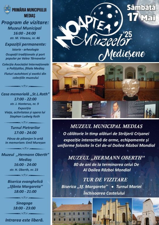 Primăria Municipiului Mediaș, prin Direcția pentru Cultură, organizează în data de 17 mai 2025, evenimentul anual care marchează Ziua Internaţională a Muzeelor, desfășurată pe plan local sub egida „Noaptea Muzeelor Medieșene”, o celebrare culturală a tuturor instituțiilor din acest domeniu.