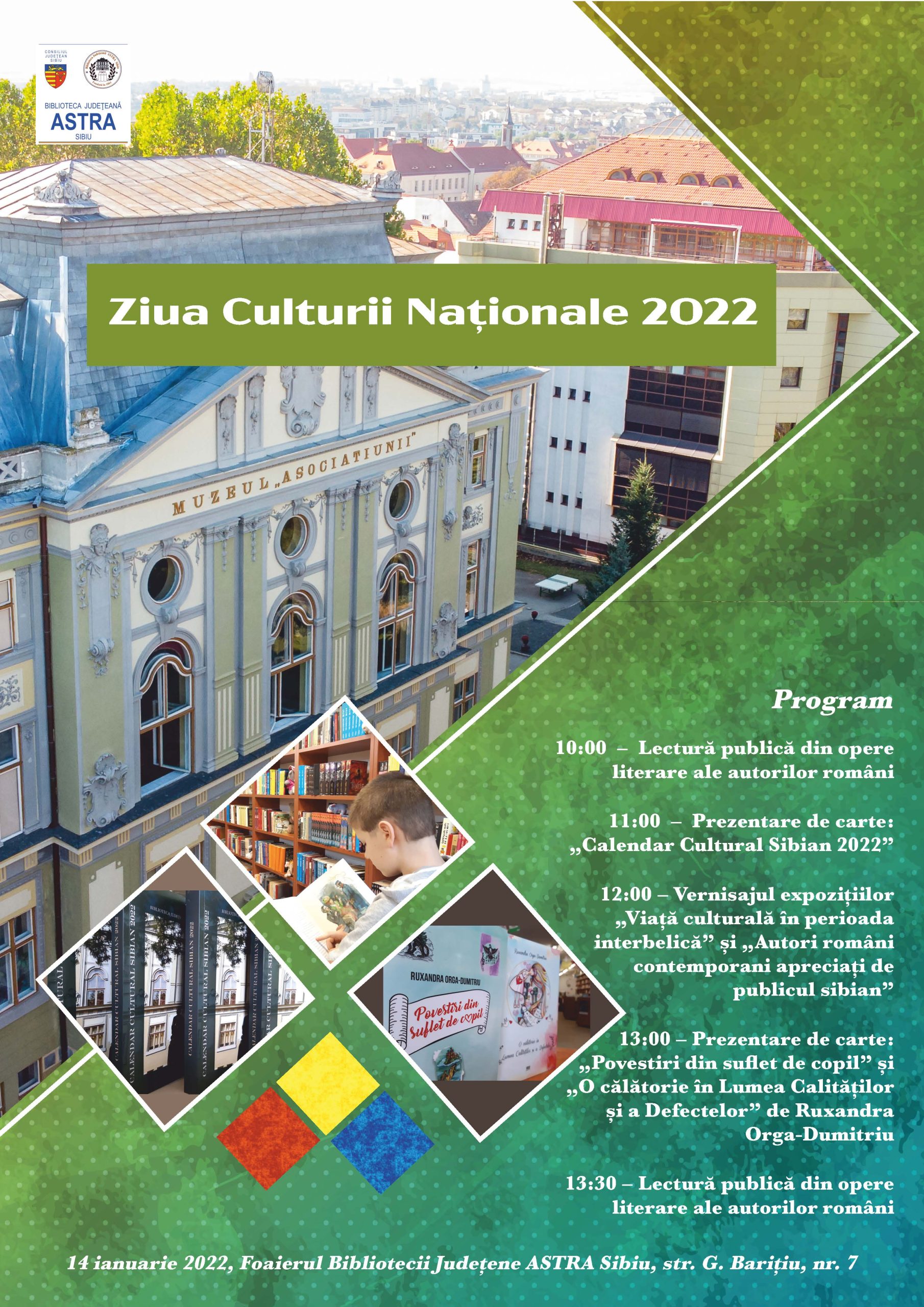 Ziua Culturii Naționale va fi sărbătorită mai devreme la Biblioteca Județeană ASTRA Sibiu. Instituția culturală organizează, în 14 ianuarie, evenimente și activități menite să omagieze reprezentanți ai culturii și literaturii române, în foaierul Corpului B.