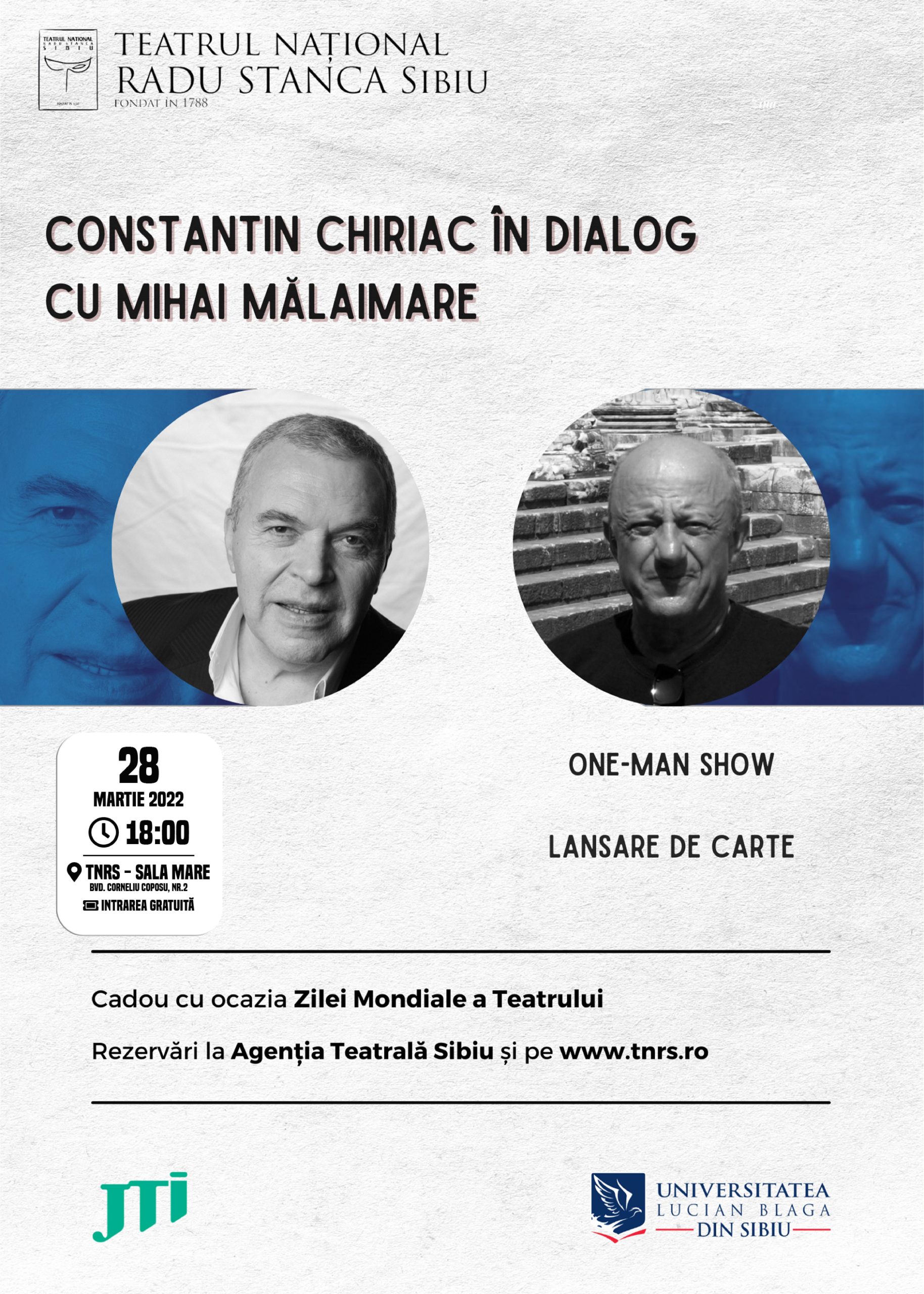 Apoi, în 28 martie, începând cu ora 18, la Sala Mare a TNRS, este programat un eveniment special gratuit care include trei momente: conferința „Constantin Chiriac în dialog cu Mihai Mălaimare”, o lansare de carte și one man show-ul „Actorul”, semnat de același Mihai Mălaimare. Accesul la evenimentul din 28 martie se face în baza rezervărilor la Agenția de bilete sau pe www.tnrs.ro.