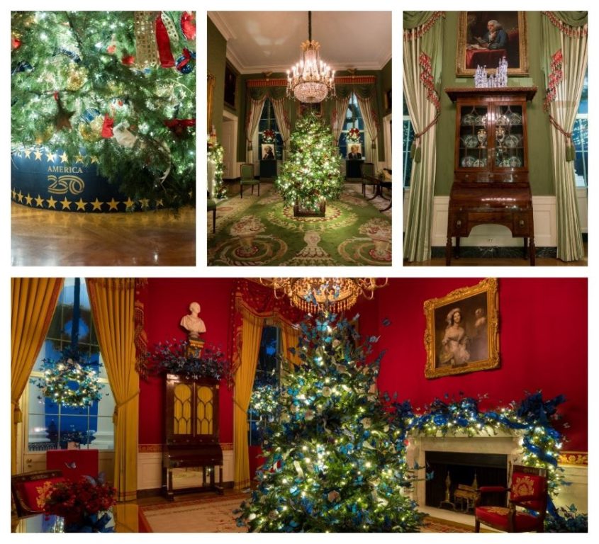 În onoarea tradiției, 75 de coroane semnătură ale doamnei Trump, cu funde clasice roșii, împodobesc ferestrele Casei Albe, iar peste 50 de brazi de Crăciun, peste 200 de metri de ghirlande, peste 7600 de metri de panglică și 10.000 de fluturi umplu holurile și creează căldura sărbătorilor.