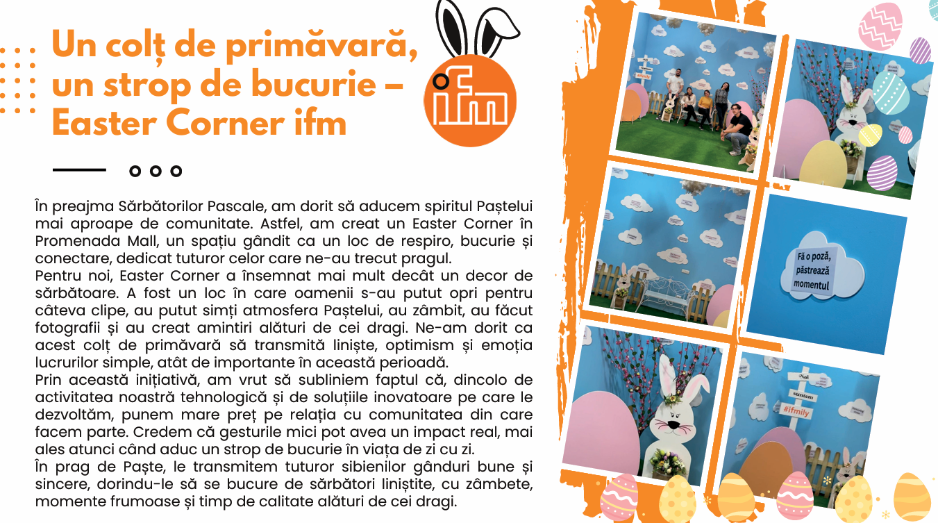 Pentru echipa ifm, acest colț de primăvară a reprezentat mai mult decât un aranjament festiv. A fost un punct de întâlnire unde oamenii s-au putut opri pentru câteva clipe din agitația cotidiană pentru a simți atmosfera sărbătorilor, a zâmbi și a imortaliza momente dragi prin fotografii alături de familie și prieteni. Mesajul central al spațiului, „Fă o poză, păstrează momentul”, i-a încurajat pe trecători să prețuiască emoția lucrurilor simple.